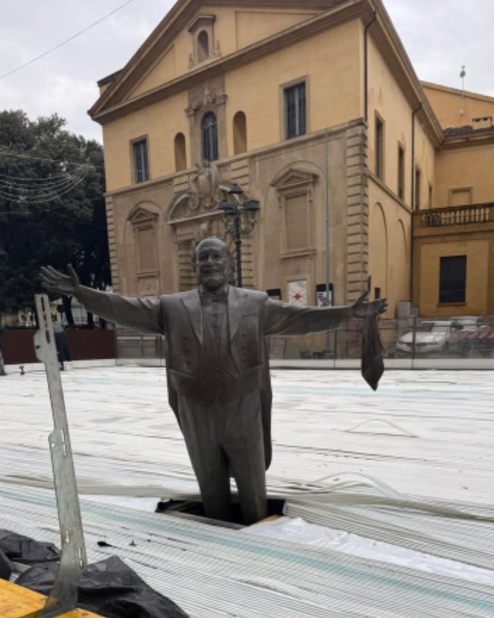 À Pesaro, la magie de Noël a pris une tournure inattendue depuis que la municipalité a installé une patinoire autour de la statue de Luciano Pavarotti inaugurée en 2024 juste en face du Teatro Rossini. L’installation d’environ vingt-quatre mètres sur douze emprisonne le Tenorissimo dont seuls le buste et les bras restent visibles — ce qui donne l’impression que le bronze est planté au milieu de la glace.