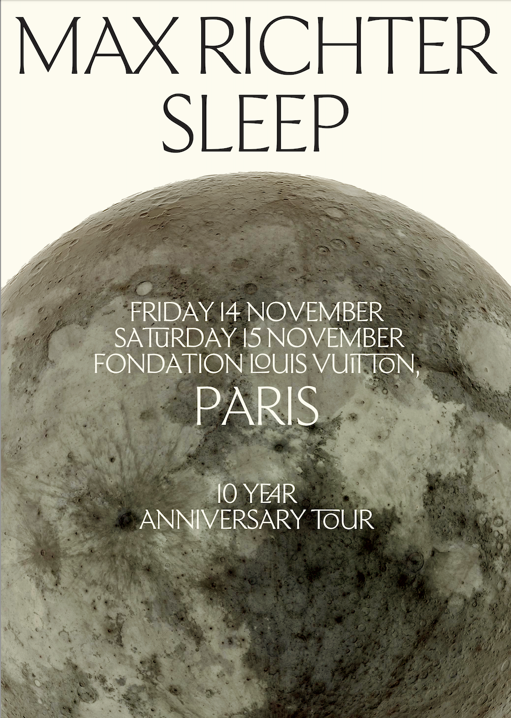 SLEEP – Parcours musical dans l’exposition « Gerhard Richter » Vendredi 14 novembre et Samedi 15 novembre 2025 de 23h à 7h Max Richter, piano et composition Grace Davidson, soprano Ben Russell, violon Natalia Bonner, violon Nick Barr, alto Ian Burdge, violoncelle Chris Worsey, violoncelle ∙ 20h : Accueil des spectateurs ∙ 20h – 22h : Accès à l’exposition « Gerhard Richter » et aux espaces de restauration ∙ 22h : Ouverture des portes de l’Auditorium ∙ 23h – 7h : SLEEP - 75 couchages seront disposés dans l’Auditorium. (Pour chaque spectateur, un matelas, un drap housse, un oreiller, une couverture et un masque de nuit sont mis à disposition.) ∙ 7h – 8h : Un petit-déjeuner est servi aux spectateurs au restaurant Le Frank Tarif : 200€ Vendredi 14 novembre et Samedi 15 novembre de 23h à 1h À l’occasion du concert de Max Richter dans l’Auditorium, la Fondation propose une visite nocturne et musicale de l’exposition « Gerhard Richter ». De 23h à 1h du matin, les visiteurs parcourent librement l’exposition tout en profitant de la retransmission en direct des deux premières heures de « SLEEP ». ∙ 21h30 : accueil des visiteurs pour une introduction à l’exposition en présence des médiateurs culturels et accès aux espaces de restauration sur place. ∙ 23h – 1h : en direct de l’Auditorium, diffusion vidéo dans le Hall et diffusion audio dans les Galeries. Tarif : 20€