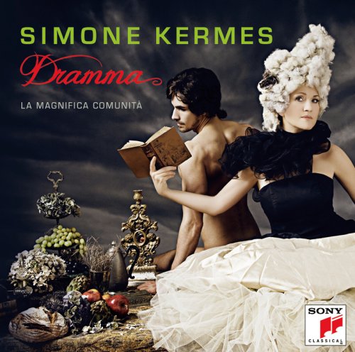 Sous la sobre appellation de « Dramma » dont les lettres rouges ornent une pochette délibérément chargée, mettant en scène figures et objets du baroque, le nouveau disque de Simone Kermes présente un spicilège d’airs virtuoses du XVIIIe siècle dont sept sont ici enregistrés pour la première fois. Le texte – celui du dramma per musica – semble placé au centre, comme le suggère le livre ouvert tenu par la cantatrice sur la photo-tableau, dans la nudité de ses affects et les ornements de ses atours musicaux. Dès le premier air, « Per trionfar pugnando », extrait de l’Arianna et Teseo de Giuseppe de Majo, la voix qui rivalise avec la trompette, sur un tempo très enlevé, relève le défi que représente l’accumulation des difficultés techniques de cet air de vengeance.