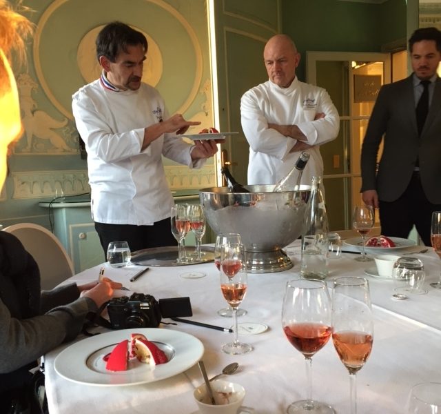 Vient le moment de mettre un terme à ce qui, depuis une heure, s’apparente au supplice de Tantale et d’ouvrir enfin ses papilles. Dans un accord mets-vins nécessaire au processus créatif de toute pâtisserie, un Champagne rosé demi-sec et un Cabernet d’Anjou également rosé accompagnent la dégustation avec – ô surprise ! – non pas une proposition mais trois. La première, dite « de voyage » parce que constituée d’ingrédients autorisant une conservation sur plusieurs jours, dévoile un cœur d’amandes. La douceur de la Valencia – cultivée en Espagne, un gage de qualité – contraste avec la vivacité de la framboise ; son moelleux avec le croustillant d’un biscuit qui pourrait être de Reims. Les deux propositions suivantes, assez similaires, ont une durée de conservation moindre. Là, la crème relevée de framboises remplace l’amande. Elle est posée sur un socle de pailleté feuilletine – des brisures de crêpes dentelles – qui apporte à l’ensemble une touche croustillante. Ce biscuit, plus épais dans une version que dans l’autre, introduit aussi une saveur cacaotée que les amateurs de chocolat pourraient apprécier.