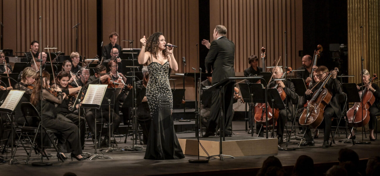 Dans la deuxième partie, l’orchestre brosse avec gourmandise les arrangements rutilants que Johann Farjot a réalisé pour accompagner les chansons interprétées par Adèle Charvet (à quand une comédie musicale composée par lui ?). Cette fois la mezzo-soprano les interprète, micro à la main, avec une élégance hors pair, une classe et un charisme qui a touché le public (Coup de chapeau aux solos de clarinette et de violoncelle dans « J’ai deux amours » !). Il est dommage cependant que son beau timbre et la richesse de sa voix ne parviennent pas à s’épanouir vraiment dans ce répertoire (à la radio cela passera beaucoup mieux). Mais quelle artiste et c’est ce qu’on retiendra !