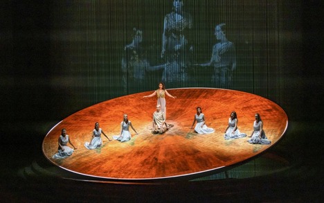 Mettre en scène un opéra de Glass n’est pas chose aisée, puisque le livret ne propose pas d’intrigue ni de véritable narration à proprement parler. Akhnaten, tout comme les deux autres opéras de la trilogie dont il fait partie, axée autour des figures historiques célèbres, aborde le règne du célèbre Pharaon, connu pour avoir tenté, pendant une décennie, d’instaurer un monothéisme autour de Râ, dieu du soleil. L’approche de Lucinda Childs est, heureusement, éminemment symbolique. Le décor du scénographe Bruno de Lavenère présente au centre de la scène un immense disque couleur de feu, inclinable à volonté et pivotant sur lui-même, et sur lequel les personnages principaux évoluent. Au fond de la scène, des vidéos, signées Etienne Guiol, montrent tantôt d’étranges motifs, des figures fantomatiques dansantes ou encore des images rappelant la symbolique égyptienne antique, à grand renfort de hiéroglyphes ou de scarabées géants.