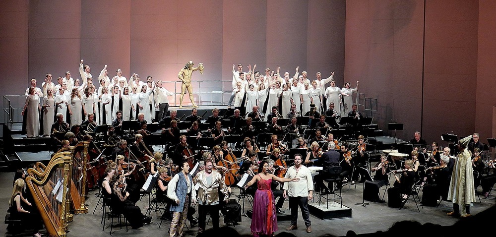 Après une Damnation de Faust d’anthologie, que nous avait offert le Festival Berlioz l’an passé, John Eliot Gardiner, familier de l’ouvrage, a choisi la version parisienne révisée, riche en péripéties comiques, de très loin préférable à la version allemande de Weimar, la plus jouée. Un jeune homme de 76 ans, dont les qualités sont connues, dirige ce soir la formation idéale, qu’il a forgée, pour nous offrir le plus beau des Benvenuto Cellini. L’Orchestre Révolutionnaire et Romantique et ses instruments d’époque est le gage de l’authenticité des couleurs que revêt l’œuvre. Le Monteverdi Choir, qu’il fonda il y a longtemps, s’est évidemment renouvelé, tout en cultivant ses qualités initiales. La direction insuffle une vie constante à ce long chef d’œuvre, mal aimé pour des raisons que l’on s’explique mal. Car savoureuse en est la verve humoristique, riche en insultes et jurons, anticipant ceux du capitaine Haddock, associée à la vivacité dramatique : on n’est pas loin de l’esprit de Gianni Schicci. L’écriture, jamais pédante, riche en effets, et sa traduction sonore nous réjouissent, sans que jamais l’attention se relâche. Pour mieux connaître les sources historiques de l’ouvrage, les curieux se reporteront utilement à l’excellente contribution de Cédric Manuel (Benvenuto Cellini : la gloire était sa seule idole).