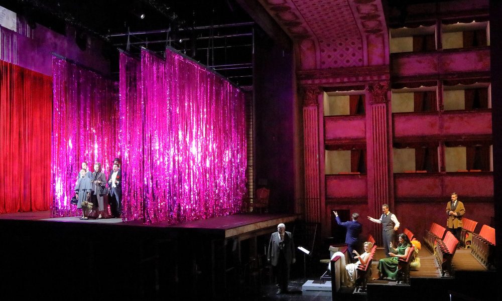 La force de la mise en scène de David Marton, dont la recréation est confiée à Andreas Weirich, est de parvenir à traiter tous ces aspects de front, avec équilibre. Le choix du décor, signé Christian Friedländer nous place face à un opéra, qui semble librement inspiré du Palais Garnier, en coupe, avec vue sur les fauteuils, la fosse, la scène et les coulisses du sous-sol. Les spectateurs évoluent, au gré de leur conversation, dans les gradins, puis sur scène, laquelle se transforme, pour les besoins de la deuxième partie du spectacle, en jardin d’hiver de Madeleine. Ce décor a le mérite de souligner d’emblée le dispositif de mise en abîme, mais il n’est pas nécessairement des plus subtils (d’autant que Robert Carsen a déjà eu cette idée) et d’autre part, nous avons du mal à nous projeter dans le salon de Madeleine pour la dernière scène qui perd de fait en intensité et en puissance.