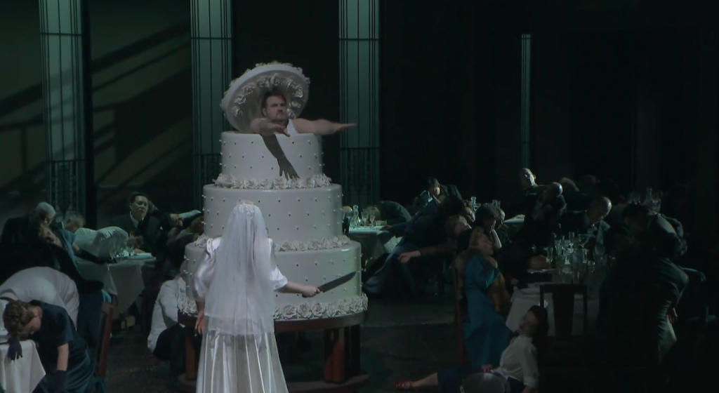La scène du mariage commence avec le brillant numéro aviné de ce personnage qu’on appelle traditionnellement « le balourd miteux » (« pauvre diable » serait une meilleure traduction de zadripannyy muzhichok), le souffre-douleur bedonnant et touchant de Boris. Alexander Kravets, spécialiste du rôle, excelle dans le registre pathético-bouffon. C’est un de ces petits rôles que Barkhatov dessine attentivement, dans une subtile balance entre cruauté et dérision. La scène permet aussi d’entendre le beau timbre du chef de la police (Oleg Budaratskiy) et un chœur de soldats fortement charpenté par un Coro della Scala comme toujours éclatant.