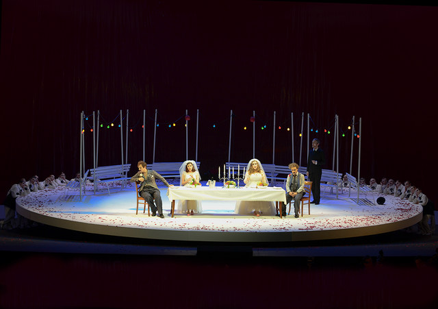 C’est Andreas Kriegenburg qui est à la manœuvre pour ce Così fan tutte du Semperoper Dresden. Il s’agit de la reprise d’une production de 2014 du metteur en scène magdebourgeois. Kriegenburg est un habitué des scènes européennes les plus diverses ; il assure depuis une quinzaine d’années des régies d’opéra à Francfort (Tosca), Berlin, Hanovre, Vienne, Hambourg, Munich (Ring complet en 2012), entre bien d’autres et récemment Simon Boccanegra au Festival de Salzbourg 2019.