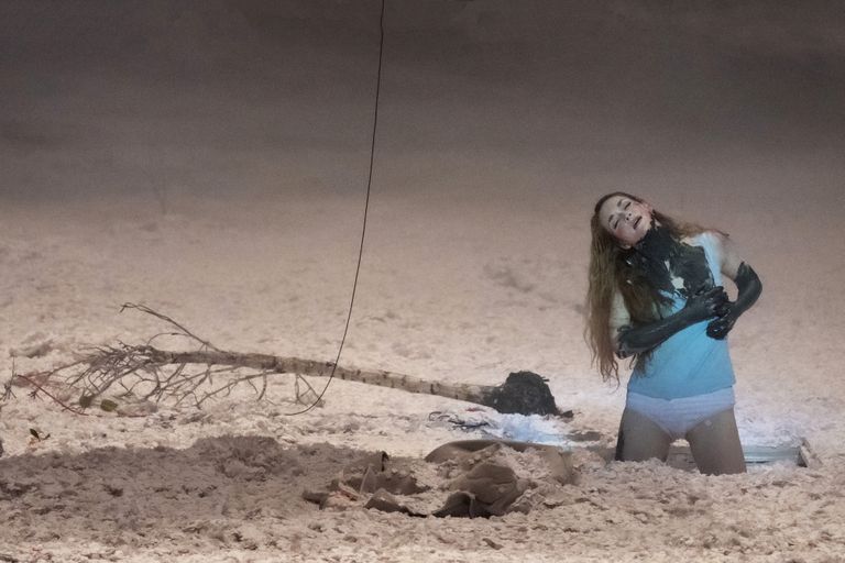 Romeo Castellucci transpose ; rien d’étonnant à cela. Nous ne sommes plus dans la Grèce antique, mais au milieu d’une plaine éteinte, gelée, où règne le désespoir ; le cor anglais qui doit inviter à la fête, sonne dans le vide. Nous sommes dans un paysage enneigé au bord de l’apocalypse, sans que nous sachions d’où celle-ci viendra. Tout, le climat, le froid, le temps s’est figé. Cela donne, avec la neige, un tableau abstrait, et les flocons qui tombent de façon presque ininterrompue, une heure trois quart durant, font penser au pointillisme d’un Seurat. Cette neige sert aussi à masquer les choses, ce qui contraint le spectateur à être toujours très attentif à ce qu’il discerne pour décrypter les scènes. Le monde figuré est une Antiquité en ruine ; les restes, frises, colonnes, torses sont ceux d’un univers enfoui, englouti.