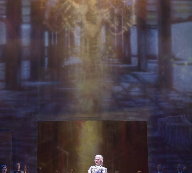 Pour ouvrir le prestigieux Osterfestpiele (le Festival de Pâques délocalisé de Salzbourg à Baden-Baden), le Festspielhaus proposait vendredi une nouvelle production du Chevalier à la rose mise en scène par Brigitte Fassbaender. Belle idée que de confier cette réalisation à celle qui a été l’un des grands Octavian de son temps et s’est retirée des scènes en 1995. Sa direction d’acteurs est subtile et tout au service des performances vocales qu’elle a évidemment contribué à perfectionner. Si les décors d’Erich Wonder se distinguent par leur sobriété (un immense canapé en guise de lit puis de salon de réception et des images projetées en fond de salle, pour l’essentiel), l’utilisation des transparents permet un étagement de couloirs de circulation intéressant et donne à voir tous les espaces (chambre, antichambre et extérieur) à la fois. L’idée est simple et plutôt réussie. Les costumes de Dietrich von Grebmer mélangent passé et présent avec des degrés de réussite divers : les couleurs sont, notamment dans la scène du grand lever de la Maréchale, très (trop) criardes, ce qui agace certains spectateurs qui auraient sans doute préféré davantage d’élégance et de distinction. Mais le caractère grinçant de la comédie et le ton doux-amer de l’œuvre en sont accentués. Le vrai problème de ces transparents est plus grave, nuisant à une parfaite perception des sons, malheureusement en partie absorbés par le manque de réverbération, ce qui est évidemment dommageable pour les auditeurs les plus éloignés.
