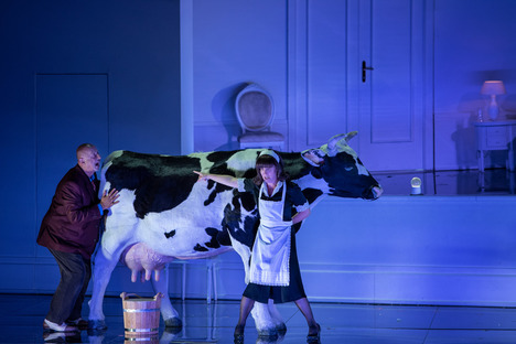 Comment représenter le sublime ? Que faire pour donner corps à la poésie ? De quelle manière incarner l’instant et chercher à le retenir, alors que tout dans sa nature le rend évanescent et fuyant ? Ce sont à la fois les questions centrales du livret du Chevalier à la rose et les défis qui se présentent pour tout metteur en scène qui s’y attelle. Damiano Michieletto semble avoir trouvé la clé, et elle est d’une simplicité déconcertante : écouter la musique, et se laisser guider par elle. C’est donc d’abord l’élan sublime du prélude et des longues plages contemplatives du 1er acte qui donnent le ton, et le metteur en scène se met au diapason : superbe décor aux couleurs délicieusement accordées, présence de trois niveaux scéniques, en écho aux entrelacs contrapuntiques de la partition, figurants en nombre et en grandes tenues, Maréchale et Octavian aussi beaux qu’amoureux. Mais de même que la comédie et le grotesque ne tardent pas à surgir sous la plume de Strauss et d’Hofmannstahl, les gags pleuvent dès qu’Ochs est sur scène, et la comédie reprend vite ses droits. L’arrivée de la vache et des fermières vaut au public de La Monnaie un éclat de rire comme on n’en avait pas entendu depuis longtemps en ces augustes murs. Tout au long des trois heures trente de spectacle, Michieletto navigue avec aisance entre les deux tons de la partition, créant une osmose parfaite entre ce que l’on voit et ce que l’on entend. Est-ce une conception « traditionnelle » de l’opéra ? On pourrait répondre par l’affirmative; surtout que l’Italien nous a habitués à des spectacles plus transgressifs (son Cav/Pag de La Monnaie en 2018 par exemple, ou son Guillaume Tell de Londres). On pourrait tout autant répondre non, en évoquant les idées qui ne manquent pas : le mari de la Maréchale apparaît à deux reprises. Loin du barbon qu’on s’imagine, c’est un homme d’une quarantaine d’années, portant plutôt bien mais rongé par les soucis, qui n’a d’autres défauts que de n’être plus aimé par sa femme. La présence de corbeaux (identifiés à la médisance?) au troisième acte est elle aussi une belle trouvaille. En bref, ce que Michieletto présente à Bruxelles est une sorte de synthèse idéale entre tradition et modernité, dont se détache quelque chose d’irrésistiblement apollinien.