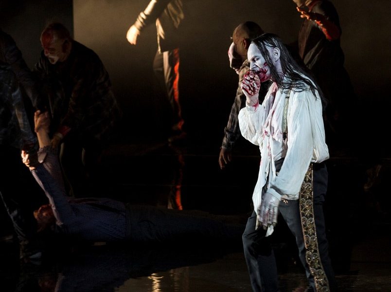 Ah, pour être gore, c’est gore. Dans la production du Komische Oper de Berlin reprise par le Grand Théâtre de Genève, le vampire imaginé en 1816 par John Polidori sur les bords du lac Léman devient d’emblée un mangeur d’organes poussé à l’acte par une armée de morts-vivants. Le sang gicle, et les zombies se déchirent entre eux les proies successives de Lord Ruthven. Tout cela est d’ailleurs assez efficace, même si le rôle-titre s’en trouve réduit à une sorte de monstre dépourvu d’humanité. Hélas, dès que le gore n’est plus possible, le spectacle se rabat sur ces deux cache-misère que sont la dérision et la vulgarité (mimiques puériles, gestuelle en dessous de la ceinture), sans oublier les gadgets inutiles (un des personnages s’acharne sur un téléphone portable qui refuse de fonctionner…). Quand le vampire s’absente, Antú Romero Nunes bascule nécessairement dans la caricature que ne justifie ni le côté conventionnel de la situation, ni la platitude du texte. Certes, le livret de Wilhelm August Wohlbrück ne brille pas toujours par une très haute qualité littéraire, mais il n’est pas le seul, et il doit bien être possible de le prendre un peu au sérieux. Supprimer ou réécrire les dialogues parlés d’un singspiel, c’est désormais monnaie courante, même si c’est rarement avec beaucoup de succès. Là où le procédé dépasse les limites de l’acceptable, c’est quand il s’accompagne d’un remaniement complet de la partition, dont une bonne moitié passe à la trappe. Le spectacle dure une heure et quart, quand l’intégrale de studio parue chez Capriccio propose plus de deux heures de musique. Et sur ces 75 minutes que dure le Vampyr genevois, il faut compter avec les effets sonores ajoutés par Johannes Hofmann pour renforcer l’atmosphère SF souhaitée par le metteur en scène et par son dramaturge, Ulrich Lenz (il serait dommage de ne pas mentionner son complice dans le crime). Les différents numéros répartis sur deux actes par Marschner sont ici réduits de moitié et complètement réagencés, tous les personnages secondaires disparaissent (la première victime du vampire, n’ayant plus rien à chanter, peut ainsi être remplacée par une figurante allègrement dépecée).