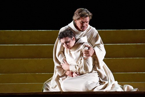 Pier Luigi Pizzi a réalisé une mise en scène épurée au maximum, et qui, à défaut d’originalité, occupe bien tout l’espace devant le mur du Sferisterio. Une grande croix, légèrement inclinée, domine la scène séparée en trois espaces. Au centre, un podium de quatre marches monté sur tournette, et, de chaque côté, deux grands espaces marqués chacun au sol d’une croix où les moines viendront s’aligner. Aucun élément vertical de décor, ce qui n’est pas gênant esthétiquement, si l’on ne percevait à plusieurs reprises une espèce d’écho inhabituel. Globalement, la mise en scène est efficace et respectueuse à la fois de l’action et de la musique : nous dirions qu’elle est totalement classique et « Pizienne », avec les costumes essentiellement en noir, blanc et grège, et les éclairages comme toujours remarquables de Sergio Rossi. On remarque toutefois quelques moments de l’action où les acteurs semblent avoir été laissés à eux-mêmes, sans directives, mais cela peut être lié à une première représentation et à l’absence d’un protagoniste. Surtout, on relève à plusieurs reprises des problèmes d’ensemble entre les deux groupes de choristes placés aux deux extrémités opposées de la scène, problème qui se renouvelle avec la grande ligne des choristes placés sur le devant de toute la longueur de la scène, dans l’acte III.