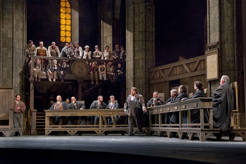 Depuis 1993, la production d’Otto Schenk a pris beaucoup de patine. Mais pour l’européen maintenant habitué (ou résigné selon ses goûts) à des visions décapantes des œuvres, ces Maitres chanteurs font souffler un certain vent d’originalité. Les décors et la direction d’acteur ? Merci de vous reporter au livret et à ses didascalies : tout y est ! Au ruban près, de la chapelle à la cellule du marqueur, aux rues à colombages, à la vigne vierge sur le mur de la maison de Pogner, à la prairie où a lieu le concours… Le tout dans une opulence de couleurs et d’étoffes. Spectacle « à la grand-papa » ? Peut-être, mais force est de constater qu’il a sacrément de tenue. Pour les interprètes de la soirée, cette mise en scène fonctionne comme un gant de cuir vieilli dans lequel l’on se glisse et l’on se meut avec aisance. Les chanteurs toujours placés dans le premier quart de la scène ne sont jamais mis en danger. Les ressorts comiques reposent en permanence sur la truculence de la partition wagnérienne. La pantomime de Beckmesser dans l’atelier de Sachs au IIIe acte est ainsi réglée comme du papier à musique : l’individu trébuche et se cogne au mobilier en rythme, tout perclus qu’il est de la bastonnade de la nuit précédente, jusqu’à tomber nez à nez avec le poème de Sachs. La soirée s’écoule donc jovialement dans cette volonté manifeste d’éviter tout commentaire ou réflexion sur l’œuvre et sa polysémie. On est loin des pistes et propositions de Katharina Wagner à Bayreuth 2007, de David Alden à Amsterdam en 2013 et tout récemment de Tobias Kratzer à Karlsruhe (il mettra en scène Tannhauser à Bayreuth en 2019).