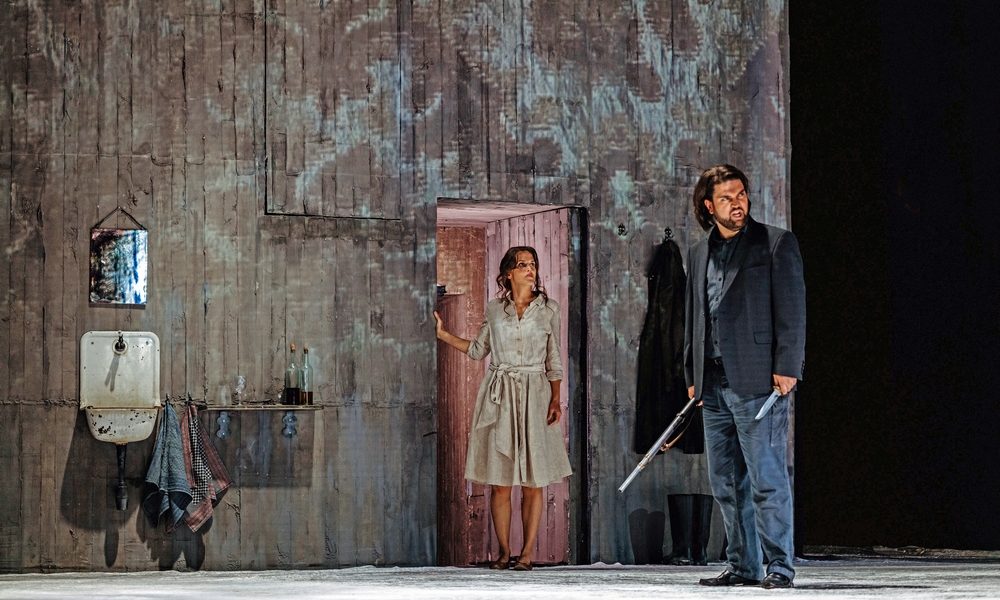 L’intérieur petit-bourgeois du Rheingold est devenu minimaliste, avec une table et une chaise, laissant la part belle aux protagonistes. D’aucuns jugeront que c’est un peu dommage de ne pas avoir conservé des liens scéniques d’une œuvre à l’autre, mais à un an d’intervalle, cela paraît de moindre importance. Comme l’an dernier, ce sont les projections vidéo de Bibi Abel qui dessinent l’espace, peut-être mieux encore, avec notamment d’impressionnantes carrières où les petites lumières de l’orchestre scintillent comme autant de minuscules lucioles à travers le voile cachant l’orchestre. Et le côté imagerie spectaculaire de ce décor en vidéo reste à sa place sans jamais écraser les protagonistes. Les éclairages de Jan Hartmann sont parfois un peu blafards, notamment aux deuxième et troisième actes, et n’aident guère à unir deux protagonistes alors seuls en scène. Les costumes de Kaspar Glarner donnent cette fois dans le noir gothique, imposant à l’ensemble de la production un aspect sinistre et glauque, sauf pour Sieglinde dont la robe printanière et les ballerines surprennent dans l’environnement rude et neigeux de la cabane du premier acte. Quant aux bottes à lacets et jupettes largement fendues des Walkyries, peut-être sont-elles le dernier recours vers un machisme féminin ?
