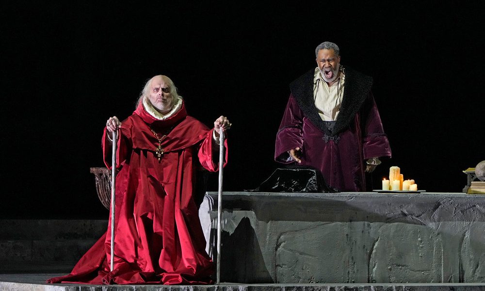 La distribution, inégale, n’appelle pas que des éloges. Meigui Zhang est un page charmant au timbre acidulé, le timbre caverneux de Matthew Rose fait de son moine un personnage mystérieux à souhait tandis que le Grand Inquisiteur de John Relyea impressionne dès son entrée en scène grâce sa voix imposante et son maquillage inquiétant. En revanche Jamie Barton se révèle peu crédible en princesse Eboli, son jeu outrancier frise le ridicule et son maintien n’est pas celui qu’on attend d’une femme de son rang. Les vocalises de sa chanson du voile sont laborieuses, néanmoins, l’insolence et l’ampleur de ses moyens auxquels elle donne libre cours dans « O don fatal », lui valent une ovation du public qui en a pris apparemment plein les oreilles. Depuis ses Rodrigue parisien en octobre 2019, la voix d’Etienne Dupuis a gagné en assurance et en largeur, il campe un héros exalté et juvénile, touchant dans ses échanges avec Carlos, excessif lorsqu’il évoque la Flandre notamment face au roi qu’il domine sans peine. Dans la scène de la prison, l’élégance de son phrasé et les multiples nuances dont il parsème sa ligne de chant contribuent à faire de la mort de son personnage un moment particulièrement poignant. A la fin de la représentation le public applaudira chaleureusement cette incarnation de haute volée.