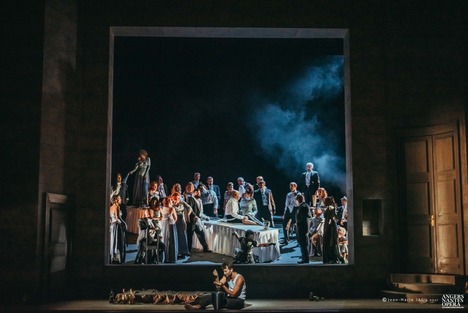 A la mise en scène, Frank Van Laecke, nom dont on avoue humblement ne pas être familier, mais dont les choix esthétiques et dramaturgiques rappellent furieusement le « style Carsen » : une production fort élégamment illustrative, dans un décor d’une sobriété pleine de bon goût, divisé entre une zone restreinte à l’avant-scène pour les moments intimes, et un espace plus vaste qui ne se découvre que pour les épisodes de faste. Ce beau décor de pierre grise, ces chaises en rang, cette table de banquet, tout cela pourrait venir d’un spectacle signé Robert Carsen, où manquerait juste une idée directrice plus nettement dessinée. Frank Van Laecke avait monté une belle Katia Kabanova à Rennes en février 2018 ; même si l’opéra de Thomas n’est pas la pièce de Shakespeare, on pouvait attendre pour Hamlet une vision peut-être un rien plus audacieuse. Le fil conducteur semble être ici la cendre : le héros commence par jouer avec l’urne contenant les restes de son défunt père, il se saupoudre ensuite de ces cendres, avant de vider toute l’urne sur son oncle l’usurpateur. A la toute fin, une pluie de cendre tombera des cintres. Pour la représentation théâtrale qui doit confondre l’assassin, le roi, la reine et la cour de Danemark prennent place dans la salle même. Aux troisième et quatrième actes, la présence de la mort est renforcée par un bel usage du chœur, assis à l’arrière-plan et portant des masques-crânes. Fluidité des enchaînements, raffinement visuel, et ridicule toujour évité : ce sont là de grands atouts, il faut le reconnaître.