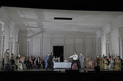 En effet le compositeur australien a écrit une partition puissante qui happe l’auditeur dès les premières mesures, progresse comme un flux dense et irrépressible avec un rythme soutenu et angoissant, scandé par les nombreuses percussions placées dans la fosse mais aussi dans les loges de côté d’où proviennent d’étranges sonorités, perceptibles dans les cinémas équipés d’une bonne sono. Les harmonies d’un accordéon se mêlent par moment aux instruments traditionnels de l’orchestre notamment lors de la représentation donnée par les comédiens. Le second acte plus bref et moins tendu que le premier comporte deux temps forts, la scène de la folie d’Ophélie et le dénouement aussi spectaculaire que violent que l’on reçoit comme un coup de poing en pleine figure. Le livret de Matthew Jocelyn suit pas à pas la trame du drame de Shakespeare mais se concentre sur huit personnages principaux. Pas de scène de comédie dans ce texte, seuls les personnages épisodiques de Guildenstern et Rosencrantz confiés à des contre-ténors piaillants et ridicules, prêtent à sourire. L’intrigue est située dans les années 50, comme en témoignent les robes de soirée des femmes, représentatives de la mode de cette époque, le premier acte se déroule dans l’immense salle de réception d’un manoir princier dont les cloisons amovibles se réorganisent pour créer les autres lieux de l’action. Ce décor astucieux de Ralf Myers permet des changements de tableau à vue. La mise en scène de Neil Armfield, d’une redoutable précision, s’articule autour d’Hamlet, omniprésent sur le plateau, c’est à travers lui que nous percevons les différents événements qui se succèdent.