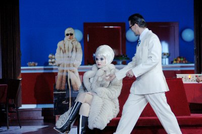 La poupée Olympia apparaît façon poule de luxe, cheveux blancs, quasiment nue sous sa fourrure blanche, lunettes de soleil et bottes de plastique noir à talons. Coppelius s’occupe, avec tenailles et collyre, à lui greffer des yeux. Assise les jambes écartées (ce que l’un des invités s’évertue à photographier en gros plan), Olympia épluche une banane pour que les choses soient bien claires. A la fin de la valse, elle se retrouve assise sur Hoffmann allongé, et semble y prendre un grand plaisir (ce n’est pas nouveau !). Au passage, elle émascule un invité et se retrouve la bouche en sang. A la fin, Coppelius lui arrache les yeux et Olympia erre sur scène, ses deux nerfs optiques sortant de derrière ses lunettes, avant de s’effondrer. Plus Grand Guignol que fantastique.