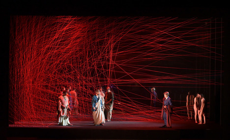 Dans la deuxième partie du spectacle, les Parques – symbôles du destin qui avance – ont tissé un tel réseau de fils qui s’entrecroisent du sol au plafond et constituent à eux seuls un décor modern style. On voit alors l’antiquité s’inviter dans le débat : apparaissent des personnages en habits égyptiens, et même des divinités anciennes, aussi nues que sur les monuments égyptiens d’époque. Soudain – et là, les choses se gâtent – une bâche en plastique descend en guise de rideau de scène, semblable à celles que l’on voit sur les chantiers de travaux publics. Bonjour la poésie ! Plus tard, au moment des saluts, cette bâche se décrochera malencontreusement et tombera sur les acteurs en train de saluer ! Pas de chance avec la bâche ! Rideau…