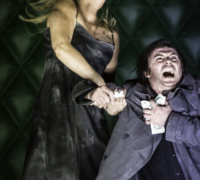 Ce n’est pas la première fois qu’une Dame de Pique est vue à travers le prisme de la névrose d’Hermann : Lev Dodin à Bastille ne s’y était pas pris autrement, mais son choix de situer l’intrigue dans l’asile psychiatrique où le héros est enfermé ne tenait pas jusqu’au bout de l’œuvre. Selon une méthode désormais éprouvée, Robert Carsen choisit de rendre l’obsession du jeu en enfermant l’action dans un décor unique, le monde des tapis verts, dans un décor uniformément vert et capitonné. Il faut bien sûr oublier les moments censés se dérouler en extérieur, mais le répertoire lyrique a vu bien pire, et il y a une cohérence implacable dans un drame qui s’ouvre et s’achève dans une salle de jeu. Il y a aussi – c’est le prix à payer – une relative monotonie car rien ne ressemble plus à une scène de tripot qu’une autre scène de tripot : la « vraie », celle du troisième acte, n’est guère plus décadente que celles qui remplacent les scènes de foule des deux actes précédents, et il ne faut pas trop prêter attention au fait qu’Eletski est alors censé mettre les pieds pour la première fois dans un tel lieu de perdition.