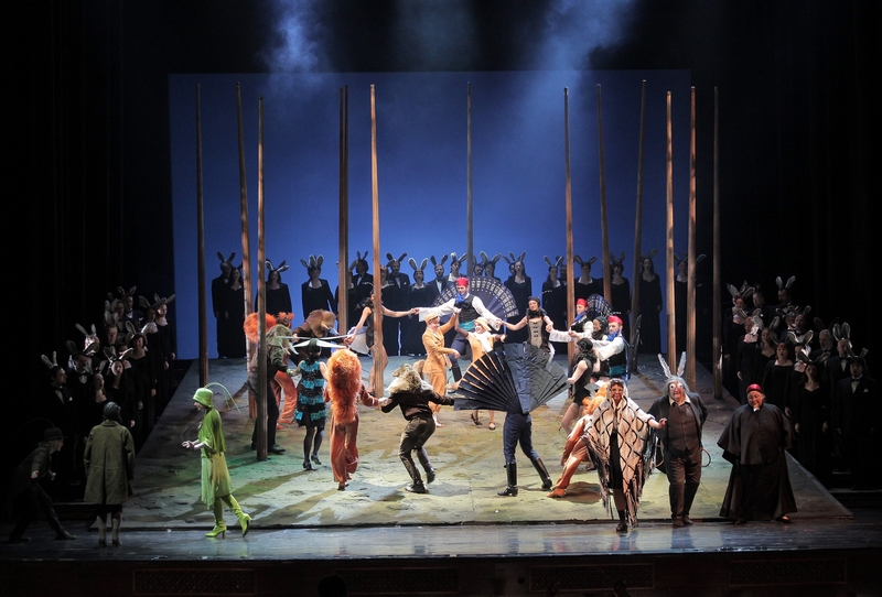 Confronté à la difficulté de mettre en scène simultanément hommes et animaux, Ondřej Havelka opte pour la meilleure des solutions : la poésie. Organisée autour d’un plan incliné d’où surgissent différents décors grâce à un système de disques pivotants et de trappes actionnées par des rongeurs facétieux, sa mise en scène s’apparente à un vaste ballet féérique où danseurs confirmés se mêlent aux choristes et figurants. Les costumes sont d’une éloquence réjouissante. Libellule, poules, lapins et autres bestioles sont identifiables au premier coup d’œil. Le Garde-chasse en pince pour Terinka qu’il lutine entre deux tableaux et, dans un geste de clémence iconoclaste libère à la fin de l’opéra la fille de la Petite Renarde (alors qu’il est supposé n’être pas parvenu à la capturer). Ces quelques libertés prises avec le livret ne contrarieront que les puristes ou les mauvais coucheurs, muets ou absents ce soir-là si l’on en juge à l’unanimité de l’ovation finale.