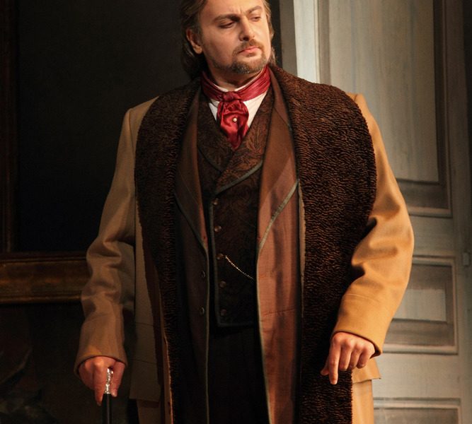 Benjamin Bernheim a pour lui un timbre argenté, quoique peu caractérisé, une projection très concentrée qui semble viser l’auditeur comme un laser, et une diction impeccable qui rend chaque mot de son Alfredo parfaitement compréhensible. Le chanteur est également d’une grande musicalité et dispose d’une technique excellente qui lui permet par exemple de jouer avec intelligence sur les registres mixte ou de poitrine. Il est dommage que son phrasé ne soit pas au même niveau : combien de phrases précipitées (« iovivokuazinchielo »), de mesures chantées de façon trop métronomique, là ou un chanteur italien laisserait respirer la phrase et donnerait davantage de sens par le simple pouvoir du chant…. Vocalement, mais aussi scéniquement, Bernheim propose une interprétation moins latine que typique du demi-caractère de l’opéra français. Cette approche fait merveille dans la rencontre du premier acte et l’air du second, mais la cabalette (sans contre-ut conclusif, d’ailleurs non écrit) manque de vaillance et laisse le public indifférent. La scène chez Flora est jouée avec la sobriété d’une haine contenue, mais le dernier acte manque de pathos, comme si Alfredo restait en retrait, dépassé par les événements. Le Germont d’Igor Golovatenko manque un peu d’imagination, avec une interprétation peu fouillée et assez monolithique. Vocalement, si le grave est un peu faible, le reste de la tessiture est irréprochable et les aigus superbes. Pour parler jeune : « il envoie du son ». Comme souvent sur cette scène, les seconds rôles sont impeccablement tenus (le Marquis D’Obigny de Jeremy White est en particulier irrésistible). Les chœurs sont excellents.