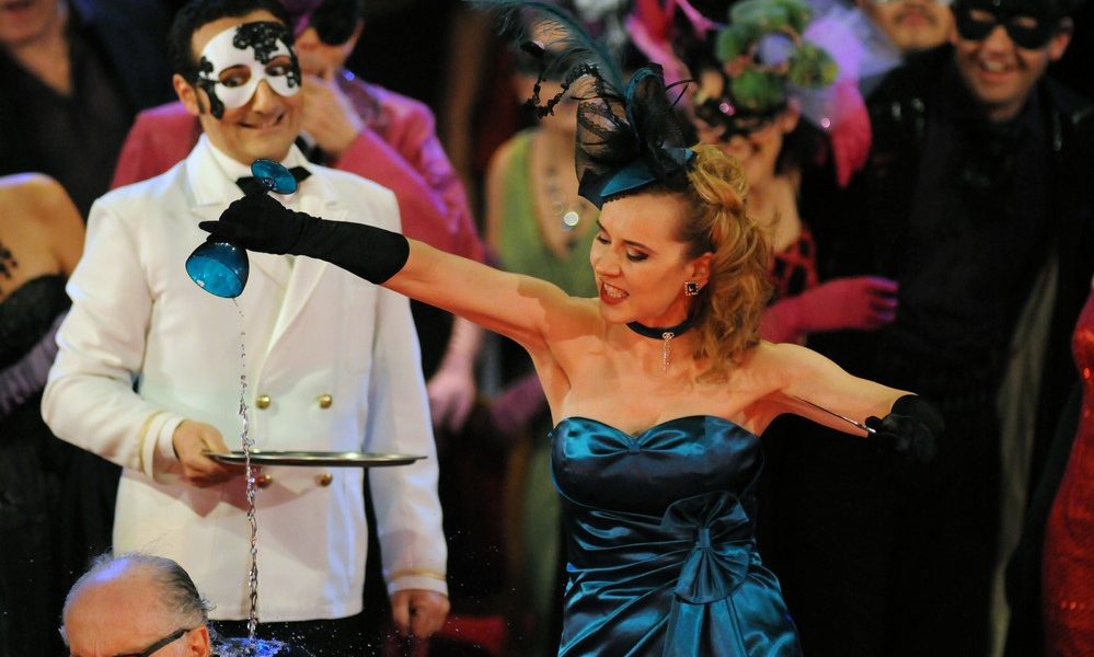 Magie d’Offenbach, magie de l’opéra : pour cette représentation strasbourgeoise de La Vie parisienne, le metteur en scène Waut Koeken a imaginé de doubler le rythme trépidant de la musique et l’effervescence échevelée de l’intrigue, placées sous le signe de la fuite du temps, par une saisie nostalgique de ce retour dans un passé qui fut notre modernité. Lorsque le rideau se lève, les images d’un film en noir et blanc défilent derrière une image d’horloge dont les aiguilles tournent à rebours. Le cours de cette remontée dans le temps s’immobilise dans le silence, les couleurs apparaissent, le coup de baguette d’un prestidigitateur fait apparaître des paillettes qui donnent le coup d’envoi de l’ouverture. Belle façon de susciter l’attente, de créer l’émotion, de donner concrètement à voir la verticalité du temps avant sa représentation horizontale sur un plateau semblable à une projection de l’horloge, avec son anneau médian qui tourne à plusieurs reprises en entraînant les personnages dans son mouvement.