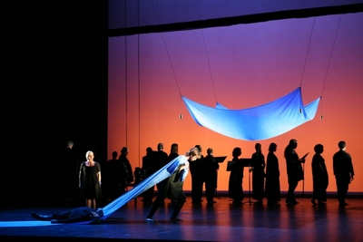 Le programme nous annonçait une version de concert simplement « mise en espace » par Richard Brunel. Et l’on se retrouve avec une véritable mise en scène, sobre il est vrai, mais on a connu des mises en scènes (en tout cas déclarées comme telles) autrement dépouillées et minimalistes ! De simples voiles bleus suggèrent tour à tour l’étang où poussent les lotus sacrés, ou la cabane dans laquelle se réfugient les amants, le tout rehaussé de beaux effets de transparence et de lumières soignés. On évite ainsi soigneusement le folklore pour se concentrer sur le drame passionnel. On notera le clin d’œil du « metteur en espace » qui utilise les pupitres tout au long de l’opéra, comme palissade, planche à dessin ou encore comme arme… Mais jamais comme pupitre ! La direction d’acteur n’a pas non plus été oubliée, les personnages, fouillés, échappent habilement aux conventions réductrices. Dans ce contexte, les quelques huées qui ont accueilli ce spectacle abouti laissent perplexe. Ces hueurs auraient-ils réellement préféré une version de concert ?