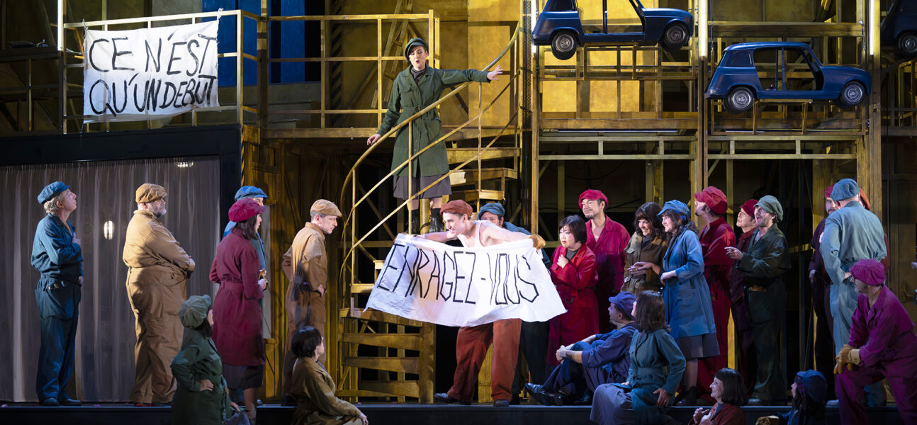 Inattendu, durable, sans précédent, l’incroyable succès de La fille de Madame Angot, suivi d’une étonnante éclipse, appelait une recréation. En complément à l’excellente présentation qu’en fit Cédric Manuel, j’ajoute l’humble témoignage de l’éditeur – Brandus – qui adressa, juste deux ans après la création, dans une somptueuse reliure, le dix-millième exemplaire ( ! ) de la partition à Lecocq, assorti d’un envoi chaleureux (1). Il y a un an, Christophe Rizoud avait rendu compte de la première parisienne. On s’est interdit de relire son propos avant de découvrir la réalisation, que signe Richard Brunel. Ce dernier a choisi de transformer en fresque sociale ce qui ne prétendait qu’à la légèreté et à la fantaisie, quitte à dévoyer La Fille de Madame Angot. Il n’est plus question des affrontements entre républicains et royalistes sous le Directoire, mais des manifestants avec la police de Papon (jamais cité), traitée ici à l’égal des carabiniers d’Offenbach. Comme le chœur chante « Crains la colère populaire » au finale du I, la transposition nous entraîne dans un Paris de mai 68, évidemment réducteur sinon caricatural, force tags, banderoles, pancartes, et même mégaphone, porteurs des revendications du temps. Ainsi, avec un bonheur incertain, le livret est-il contraint de se plier au cadre nouveau. Nous sommes chez Renault, à Boulogne-Billancourt, dont Larivaudière est le patron. Clairette y travaille à l’assemblage des R5, lorsque l’action commence : c’est la grève. Elle sera ensuite étudiante, on ne sait par quelle vertu (Paris VIII-Vincennes verra le jour peu après). Chaque auditeur, en fonction de son âge et de son vécu, s’est forgé sa propre représentation des événements de 68, et la légèreté n’est guère de mise. La tournette juxtapose la chambre nuptiale aux ateliers, étrange… « Comme si ces paroles ne contenaient pas une vérité de tous les temps » (écrit Lecocq à propos de l’intrigue politique), la transposition – toujours artificielle, gauche – confère une certaine lourdeur à l’ensemble : ça sonne faux ; ainsi, les 30 000 écus que Pitou obtient de Larivaudière pour prix de son silence, la valse chantée depuis les fauteuils de cinéma. Le texte original est savoureux, plein d’esprit, de finesse, de trouvailles. L’adaptation obligée perd une large part de ses qualités. Les passages parlés, essentiels à la caractérisation de chacun comme au jeu dramatique et à la compréhension de l’intrigue, sont réduits à la portion congrue, adaptés à la proposition. Trénitz en est la plus évidente victime, ridicule et inintelligible en américain. Richard Brunel s’est fourvoyé. Cela sonne faux, superficiel, à défaut de légèreté douce-amère (Musset demeure en filigrane, comme pour Fortunio), la tendresse, le sourire comme l’impertinence provocatrice s’effacent pour un artifice qui jamais ne convainc, malgré le professionnalisme de certaines directions d’acteurs. La bonne humeur, la drôlerie, la sensibilité se sont réfugiés dans la fosse. L’opéra-comique (ni opéra-bouffe, ni opérette) dont le charme se situe dans l’héritage de Mozart (2) comme d’Auber connaît ici une mutation : une pochade boiteuse, à laquelle on ne croit pas un instant, la prive de son naturel, de son esprit et de sa verve, malgré la direction enthousiaste de Chloé Dufresne. C’est laid, de l’usine au cinéma, digne d’une revue provinciale ou d’une comédie musicale racoleuse. Bruno de Lavenère et Laurent Castaingt nous ont habitué à d’autres réussites : costumes colorés et décors sont moches (ne manque que le formica), et les éclairages conventionnels.