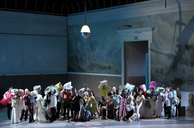 Il est étonnant que Les Indes galantes figurent parmi les ouvrages les plus populaires de son auteur. Si ce « ballet héroïque » créé en 1735 à Paris, a été la première œuvre de Rameau à gagner une nouvelle popularité au XXe siècle, bien d’autres auraient dû depuis lui voler la vedette, tant musicalement que dramatiquement. A moins que l’exotisme du livret soit la raison de l’engouement. C’est là précisément le choix que Sidi Larbi Cherkaoui n’a pas fait. On avait bon espoir de trouver un chorégraphe inspiré, et nous aurons surtout vu l’œuvre d’un metteur en scène maladroit, cherchant absolument à donner une cohérence dramatique à ce qui n’est qu’un enchaînement décoratif et symbolique. Un salmigondis politique se substitue alors au galimatias folklorique autour de chorégraphies assez répétitives, malgré de très bons danseurs. Si le prologue commençe plutôt bien (Hébé est une institutrice qui se refuse à voir partir ses élèves à la guerre, appelés par la militaire Bellone), on a déjà du mal à comprendre ce que le président des Etats-Unis fait là, et le voir revenir en Adario ne nous éclaire pas plus. Par la suite, Amour se transformera en Dame Pipi de toilettes qui deviendront confessionnal, d’où sortira le prêtre Huascar lequel mariera Valère et Emilie, etc. Si cette volonté de tisser des liens dramatiques entre les actes est louable, elle ajoute de la complexité, un même chanteur chantant plusieurs rôles, sans compter le thème des réfugiés qui vient s’ajouter après l’entracte. Quand bien même tout ce beau monde essaye de retrouver ses petits dans le final, la logique dramatique de l’ensemble nous a échappé. Enfin beaucoup d’accessoires qui auraient pu instiller une vraie poésie dans ces danses, sont souvent confinés au rôle de gadgets gaguesques (les Segways par exemple) ou trop utilisés (les vitrines, la bâche bleue, le swiffer) ou totalement inutile (l’immense hélice au dessus de la scène). Bref, beaucoup (trop) d’idées éparpillées pour un divertissement léger, lequel peut accueillir quelques réflexions politiques ou sociales (ce qu’avait très bien réussi Laura Scozzi par exemple), mais doit rester un kaléidoscope rafraîchissant propre à susciter l’émerveillement. Les décors et costumes années 60 d’Anna Viebrock (qui travaille beaucoup avec Marthaler) et Greta Goiris sont évidemment aux antipodes de cette logique.