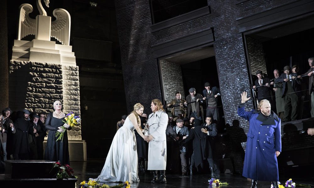 C’est ici qu’il convient d’évoquer la mise en scène de David Alden, qui gâche un peu la fête par la manière dont elle multiplie les débuts de piste qui ne mènent finalement nulle part, comme l’avait déjà signalé Yannick Boussaert lors de la création londonienne de cette production. L’action est transposée vers le milieu du XXe siècle, dans les ruines d’une ville ravagée par la guerre : soit. Le héraut (bien servi par le timbre clair de Vincenzo Neri) est une gueule cassée digne d’une toile d’Otto Dix : soit. Mais pourquoi Henri l’Oiseleur devient-il un prêtre en soutane aux allures d’illuminé, qui place lui-même la couronne sur sa tête ? Pourquoi cette dérive fascisante à partir du deuxième acte, quand même Lohengrin, arrivé pieds nus, chausse des bottes de nazillon et qu’un vaste monument à tête de cygne et à ailes d’aigle surgit dans le fond du décor ? Pourquoi est-ce finalement Ortrud qui fait s’écrouler les drapeaux eux aussi fascisants, apparus au-dessus du chœur qui, de population civile, s’est métamorphosée en armée sur le pied de guerre ? Autant de questions sans réponse qui ne parviennent pas à proposer une vision cohérente de Lohengrin. En fosse, heureusement, Alejo Pérez, le nouveau directeur musical de l’Opéra des Flandres, remporte un triomphe dû à l’irrépressible énergie qui innerve sa direction tout au long de la soirée, après un prélude dont les premières mesures manquaient pourtant un peu de magie impalpable.