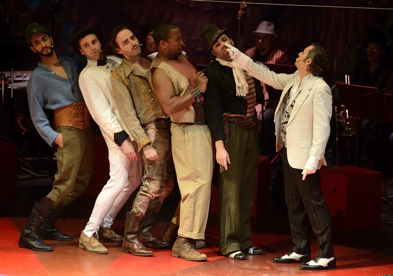 Décor de bastringue bancal, ambiance circassienne, parfums de cabaret glauque tendu à la va-comme-je-pousse de draps douteux où dansent des caricatures équivoques brossés à grands traits. Un portique famélique s’endimanche d’une guirlande d’ampoules paresseuses. La piste aux étoiles à des allures de claque. Au fond, un orchestre encanaillé en casquettes et marinières, trousse une musique crapuleuse sur des rythmes syncopés. Banjo, saxo, trompette, orgue des rues, clarinette, saxo, trompette, trombone, guitare, contrebasse, timbales, caisse claire : la bande est au complet, survitaminée par un Manuel Peskine sous haute tension. Que la fête commence ! Desbordes et Perez mènent le bal. La marque du premier est sensible : un savant équilibre entre joyeux délire et cruauté implicite.