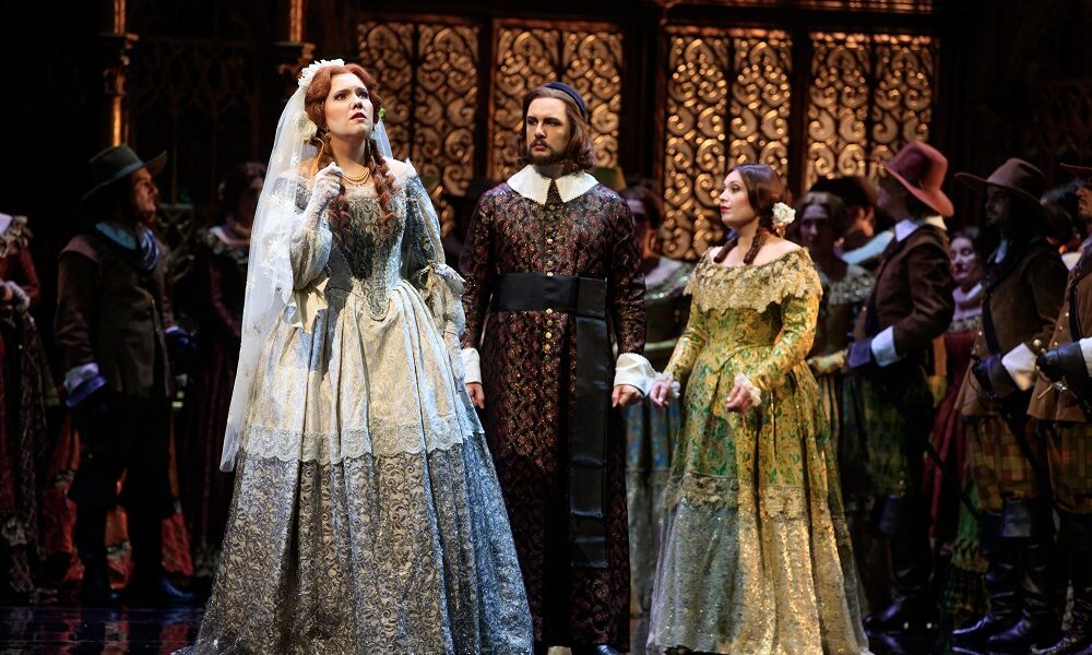 Toile peinte qui représente une haute colline boisée surmontée d’un château, haute grille de fer forgé, puissantes colonnes historiées et dorures à profusion sur ornements inspirés du gothique flamboyant, cette production de Lucia de Lammermoor en met toujours plein les yeux malgré ses presque vingt ans. Ces décors monumentaux signés Ezio Frigerio sont représentatifs, avec les costumes de Franca Squarciapino – plus Louis XIII, à vrai dire, que François II – du travail de l’équipe rassemblée par le metteur en scène Nicolas Joel, qui avait fait de la fidélité aux œuvres un style et une profession de foi. On n’en est que plus surpris de découvrir des entorses à la règle ! Menues, voire insignifiantes diront certains, elles nous semblent pourtant mériter qu’on les relève. Ainsi le bâtiment qui protège la fontaine auprès de laquelle Lucia doit retrouver Edgardo est-il, précise Cammarano dans ses didascalies détaillées, à l’état de ruine. Cette image a une fonction : montrer directement au spectateur une situation d’incurie, peut-être ancienne, peut-être à relier à la guerre civile évoquée un peu plus tôt, et installer un climat de mélancolie, voire de pessimisme contagieux. Cette production propose, elle, un bâti à colonnes surmonté d’un lanternon gothique auquel ne manque pas un pignon qui se profile fièrement en fond de scène. L’image a de quoi séduire, mais où est passée la signification ? Le traitement de la scène relève du même principe d’écart entre ce qu’ont souhaité les auteurs – car évidemment les choix de Cammarano ont été validés par Donizetti – et ce qui est proposé. Le librettiste a prévu de faire entrer en scène Lucia et Alisa dans un état « d’agitation extrême ». Toutes deux ont peur, pour des raisons différentes. Si la suivante craint qu’on les découvre dans un rendez-vous clandestin avec un ennemi, sa maîtresse semble d’abord inquiète de découvrir le motif d’une rencontre insolite. On apprendra peu après que sa nervosité a d’autres causes, que ce lieu est pour elle chargé d’épouvante, et l’annonce de l’éloignement de son « sauveur » augmentera son désarroi. En lui prescrivant une entrée semblable à une irruption, le librettiste signale au spectateur le manque de maîtrise de soi et donc la fragilité nerveuse de Lucia, que le récit de l’apparition confirmera. Il construit ainsi une progression dans l’exposition du personnage, destinée à culminer dans le déchaînement de la scène de la folie. En nous montrant Lucia déjà en scène, assise dos au public, parfaitement immobile, comme si elle se reposait ou prenait le frais paisiblement jusqu’à ce que sa suivante vienne la déranger, la mise en scène ne contribue pas à faire percevoir la symbiose totale réussie par les auteurs entre drame et musique. Ce sont de telles observations qui nous empêchent d’adhérer totalement à cette proposition scénique, par ailleurs très séduisante plastiquement.