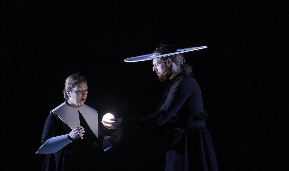 Comme souvent dans pareil cas, on assiste à un exercice de style sans lien organique avec la scène. L’on retrouve ces têtes, pleines ou faites de maillages métalliques, déconnectées du drame Shakespearien ou de son avatar verdien. Le choix de costumes New Age, identiques dans leur forme, différents dans leurs couleurs, vient s’insérer dans cette lecture. Celle-ci s’avère dès lors plus comme une redite scénique de ces œuvres du plasticien qui saturent déjà les espaces publics où elles sont installées. Les lumières, de bonne facture, évoquent un travail que n’aurait renié un Bob Wilson. Enfin, Jaume Plensa cherche dans des lettres égrainées sans logique à se connecter avec le texte et le théâtre de façon maladroite, tel cet immense point d’interrogation incongru apparu pour la scène des questions aux sorcières. Les mêmes lettres se retrouvent en broderie sur les costumes et leur pertinence scénique nous échappe. Ce sont finalement les scènes à nu, celle avant l’assassinat de Duncan et la scène de somnambulisme, qui sont les plus convaincantes et où la direction d’acteur sort de la convention. Même les ballets, donnés dans leur intégralité, ne parviennent à rehausser l’intérêt d’un geste purement visuel qui délaisse et drame et chanteurs.