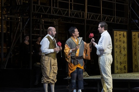 D’un réalisme éloigné de l’épure à laquelle sacrifient bon nombre de mises en scène, l’approche de Yoshi Oida a le mérite de la lisibilité. Le récit suit à la lettre le livret même si le geste scénique s’avère parfois en décalage avec les intentions musicales – l’apparition de l’enfant, le seppuku final. Deux échafaudages tubulaires, reliés en hauteur par une inutile passerelle, encadrent une estrade représentant la maison de Butterfly. Des paravents tentent de rythmer l’espace, fermé par un rideau jaunâtre et flanqué sur les côtés de deux petites fontaines que l’on croirait achetées chez Natures et Découvertes. Un tel parti-pris esthétique n’aide pas à rendre cette Butterfly inoubliable.