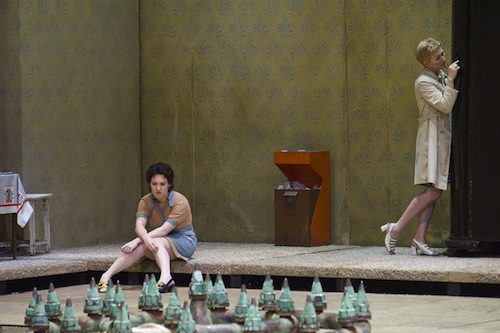 Le parti pris de Marthaler de situer Katia dans une cour d’immeuble délabré d’un pays communiste, quelques années avant la chute du mur, est juste et efficace. Il montre avec force comment une société coercitive et étouffante ne laisse aux personnes éprises d’autonomie et de liberté d’autre issue que la fuite, jusqu’au suicide même. Ce qui gêne souvent c’est un certain systématisme qui fait que cette mise en scène se « voit » trop, aux dépens de la musique. Trop de poses et de mouvements devenus mécaniques dans lesquels les chanteurs sont engoncés. Trop de moments où les chanteurs doivent chanter en fond de scène sur des tutti d’orchestre (et ce n’est pas la faute du chef, pour une fois, s’ils sont couverts). Trop d’anecdotes concomitantes, en scène, au moment où le spectateur voudrait n’être confronté qu’eux seuls personnages. Le théâtre n’exige jamais qu’un moment sublime de musique et de chant soit parasité par de multiples actions parallèles alors qu’on sait que le moindre geste extérieur nous distrait de l’essentiel (fenêtres qui s’ouvrent, figurants qui apparaissent, Kabanicha qui s’affaire sans arrêt dans sa chambre, personnages secondaires qui se mettent à danser quand le personnage chante la plus intérieure des musiques). L’ironie est le fort de Marthaler et, plus d’une fois, elle vient à point nommé, mais trop c’est trop. Ainsi, le gag du jet d’eau, au milieu de la cour, en devient vulgaire.