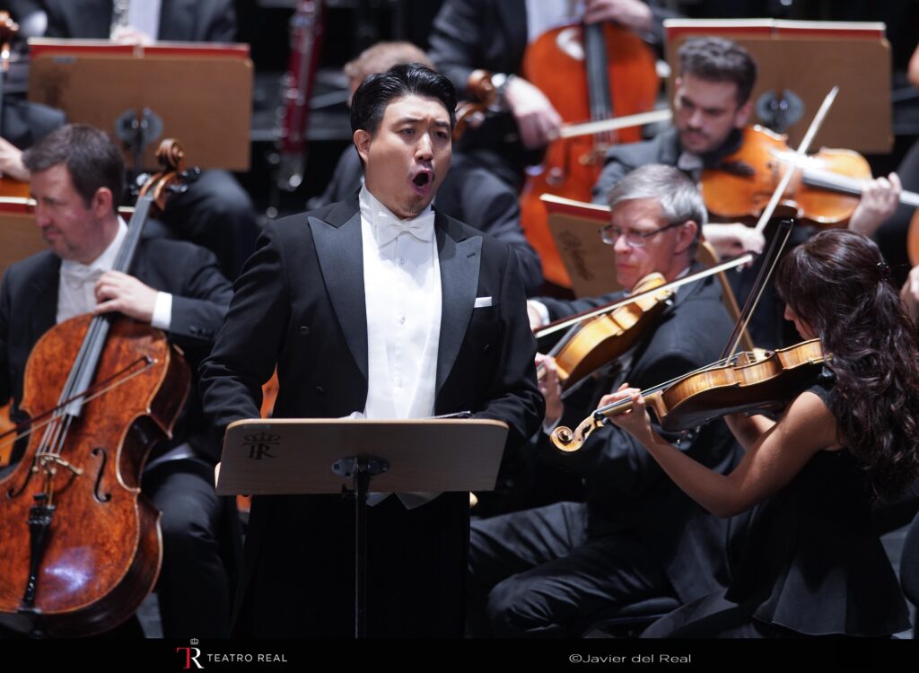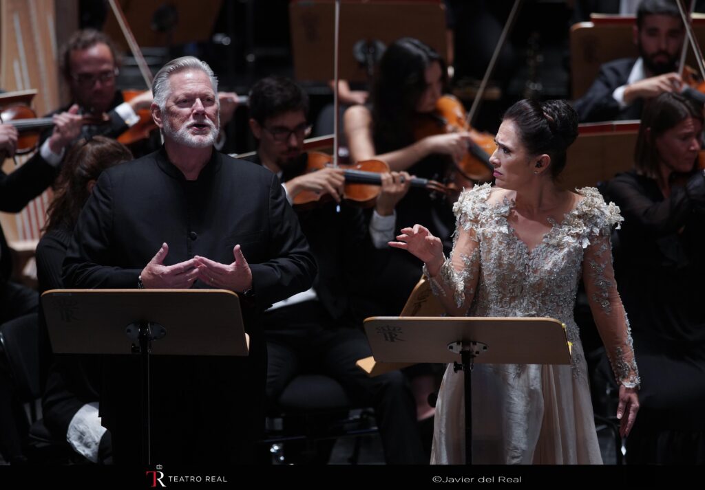 L’ouvrage réserve l’essentiel de la musique à Iris. Ermonela Jaho offre ici une magnifique composition dramatique, évoquant avec justesse les différentes émotions de la jeune fille : sa joie simple et pure initiale, la terreur (culminant dans l’air de la pieuvre, longuement applaudi), le désespoir et finalement la résignation. La projection n’est pas très puissante, mais Mascagni épargne le plus souvent à son héroïne les déchainements d’un orchestre par ailleurs puissant, et cette fragilité convient bien à l’héroïne. Bien utilisé, le léger vibrato de la chanteuse apporte même un surcroit d’émotion. Le timbre, chaud et coloré, est idéal, les piani et pianissimi sont de toute beauté, dramatiquement en situation, au service d’une interprétation frémissante. Le rôle d’Osaka correspond parfaitement à la vocalità actuelle de Gregory Kunde. On pourrait même parler d’une promenade de santé tant le ténor américain semble dominer sans effort cette tessiture tendue, avec une voix d’une incroyable jeunesse. Le haut médium est très sollicité et les aigus spinto du ténor font vibrer les murs. Alors que le personnage est totalement antipathique, le chanteur essaie de l’adoucir par son jeu, suggérant un amour et un remords sincères. Germán Enrique Alcántara offre un Kyoto au chant agréablement naturel, avec une voix chaude et puissante. Le baryton argentin campe un souteneur plus amoral que maléfique, oscillant entre l’espiègle et l’inquiétant. Jongmin Park déploie une impressionnante voix de basse, au timbre riche et profond et au noble phrasé. Après sa courte intervention à l’acte II (il lit le message pour le père d’Iris). Pablo García-López a davantage l’occasion de briller dans l’assez longue intervention du chiffonnier au début de l’acte III, avec une voix bien posée, un aigu facile et un bon phrasé. On aura également apprécié la voix chaude et bien conduite de Carmen Solís, en particulier le mélancolique air de la geisha. Le Chœur du Teatro Real est impressionnant, homogène, sonore tout en restant musical. Les différents plans de la polyphonie de l’Hymne au soleil sont rendus avec précision et clartés. Deux artistes du chœur, Iñigo Martín et Alexander González, interviennent en tant que solistes dans les rôles de deux autres chiffonniers avec des voix bien timbrées et qui passent la rampe malgré leur éloignement en fond de scène. Sous la baguette attentive et dévouée de Daniele Callegari, l’Orchestre du Teatro Real rend parfaitement justice à la luxuriante orchestration de Mascagni et son éventail de couleurs. Le chef italien sait être attentif aux chanteurs et privilégie ici la douceur et la poésie sur les accents plus vifs ou dramatiques.