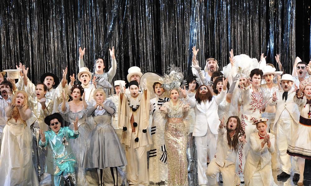 Outre le plaisir de découvrir au Festspielhaus le trop rare Mefistofele dans une version scénique, c’est l’excellence générale de tout le plateau qui frappe. L’œuvre, musicalement très riche, est exigeante et pâtit d’une trame peu narrative, difficile à exposer et raconter. Cela ne semble pas avoir été un grand problème pour le metteur en scène Philipp Himmelmann et son équipe, visiblement inspirés par le propos. On ne peut que saluer la qualité de la production, visuellement passionnante. Avec des moyens apparemment très simples – le décor se résumant essentiellement à un rideau constitué de filaments argentés où la lumière sculpte des ambiances –, l’imaginaire est sollicité en permanence. En plus de ce pénétrable à la Soto, Johannes Leiacker a conçu une tête de mort géante à l’aspect changeant, dont tous les orifices sont utilisés. La vanité en carton-pâte se métamorphose, une fois retournée, en œuf prêt à éclore, puis évoque un australopithèque ou encore le masque de Dark Vador. On se promène alors dans une sorte de résumé synthétique de culture occidentale, des origines aux fins dernières, entre fascination pour la beauté divine et observation obsessionnelle de la perversion diabolique. Ainsi, par exemple, les cavités du crâne deviennent des fenêtres où apparaissent Faust et Mefistofele avant de littéralement changer d’échelle pour vomir le diable. Ce dernier, sur sa planche de salut, semble jailli de l’orbite tel un serpent qui s’extirperait de l’œil d’un trépassé tout droit sorti d’une danse macabre médiévale. On ressent face à la scène les mêmes terreurs mêlées de dérision salutaire. Les projections vidéo de Martin Eidenberger excellent à permettre des changements d’atmosphère à vue. On ne sait que préférer : les constellations scintillantes et mouvantes entre big bang et belle nuit étoilée, les chiffres en mutation exponentielle attestant de l’activité cérébrale en rythme avec l’orchestre ou la belle vision d’une prairie pleine de marguerites. Ces fleurs s’effeuillent avant que l’on glisse vers le sous-sol aux racines envahies de vers rouges aussi dégoûtants que captivants, se muant en flammes de l’enfer dignes des plus beaux Jugements derniers flamands. Les visions d’une Marguerite qui apparaît à Faust enchaînée et égorgée ou les excès de Walpurgis sont suggérés dès lors en parfait décalage, ce qui n’ôte rien à la beauté démoniaque de l’ensemble. Il va sans dire que les lumières de Bernd Purkrabek cisellent intelligemment le tout, nous permettant de jouir des beautés d’une nature pure et viciée à la fois. Enfin, et ce n’est pas le moindre des plaisirs de ce spectacle, les costumes sont variés et cristallisent l’attention sur eux. Gesine Völlm s’est inspiré de Cecil Beaton dans My Fair Lady et on reconnaît une Eliza Doolittle entourée de tenues splendides dignes du Derby d’Ascott du film précité. On commence par entendre les phalanges célestes (le livret évoque un chœur mystique de chérubins et de pénitents) qui émergent doucement du praticable tel un franchissement du miroir à la Cocteau ; on y reconnaît pêle-mêle Charlot, Scarlett O’Hara, Mata Hari, Sissi, Marilyn, Elvis, Michael Jackson, le Baptiste Debureau des Enfants du paradis ou encore Maria Callas, dans une armée de spectres et d’icônes élégants et attirants. Les chérubins semblent tout droits sortis du Village des damnés ou de la maison hantée des Innocents. Si les références cinématographiques, littéraires et picturales abondent, la profusion ne gâte rien et la poésie sourd délicatement.