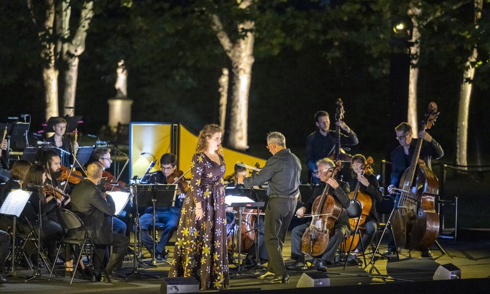 Pour le concert du soir, après avoir renoncé à un alléchant concert à l’église de Thiré, c’est en faveur du Miroir d’eau qu’on se décide, pour un programme encore dédié à Mozart et à Carl Philipp Emanuel Bach, qui avaient tous deux pour mécène le baron Van Swieten. Les airs de Mozart sont interprétés par la mezzo Eva Zaïcik, lauréate en 2018 – comme entre autres Sonya Yoncheva avant elle – du Jardin des Voix, cette pépinière de chanteurs baroques créée en 2002. La jeune femme, auréolée de prix, se présente sur la scène flottante du Miroir d’eau et la magie opère d’emblée. Mais avant d’évoquer la beauté de son chant, il faut mesurer l’impact du Miroir d’eau, bassin de 70 mètres de long bordé d’une double allée de platanes étoffée par une haie de charmes. Les spectateurs sont installés en face du bassin et de sa perspective ; pour un peu, on s’imaginerait appartenir à la cour de Louis XIV. L’espace rappelle également les jardins de la Rome antique et le célèbre Canope de la Villa Hadriana à Tivoli. Il se conclut par une magnifique rocaille et des arches végétalisées du plus bel effet. Le spectacle est enchanteur et la tombée de la nuit permet de voir peu à peu les arbres se transformer, éclairés par un simple faisceau qui les sculpte en colonnes quand les rocailles, statues et arbustes se reflètent dans l’onde, en merveilleux contrepoint baroque et en parfait éveil des sens, les senteurs estivales se mêlant au frémissement léger des feuillages et au bruissement d’ailes des oiseaux. C’est à peine si l’on s’est aperçu que le plateau flottant était sonorisé, créant une acoustique aussi stupéfiante que féerique. Disposés en éventail pyramidal, les musiciens des Arts Florissants sont conduits avec une fermeté doublée d’une grande souplesse par Paul Agnew, co-directeur du festival, dont on ne peut s’empêcher de remarquer les faux airs de ressemblance avec William Christie, tant dans l’apparence physique que dans la façon de diriger. Élégance et précision caractérisent les couleurs de l’orchestre. Quant à Eva Zaïcik, elle dégage une autorité naturelle doublée d’une noblesse dans l’interprétation que sublime la beauté de son timbre doux et moelleux. La diction est impeccable, mais le jeu minimaliste, très intériorisé. On regrette de ne pas avoir ici l’opportunité de découvrir la mezzo-soprano dans une version scénique. En attendant, on apprécie la qualité de son legato dans les airs de Mithridate. Son « Voi che sapete » lui permet de déployer des trésors de délicatesse.
