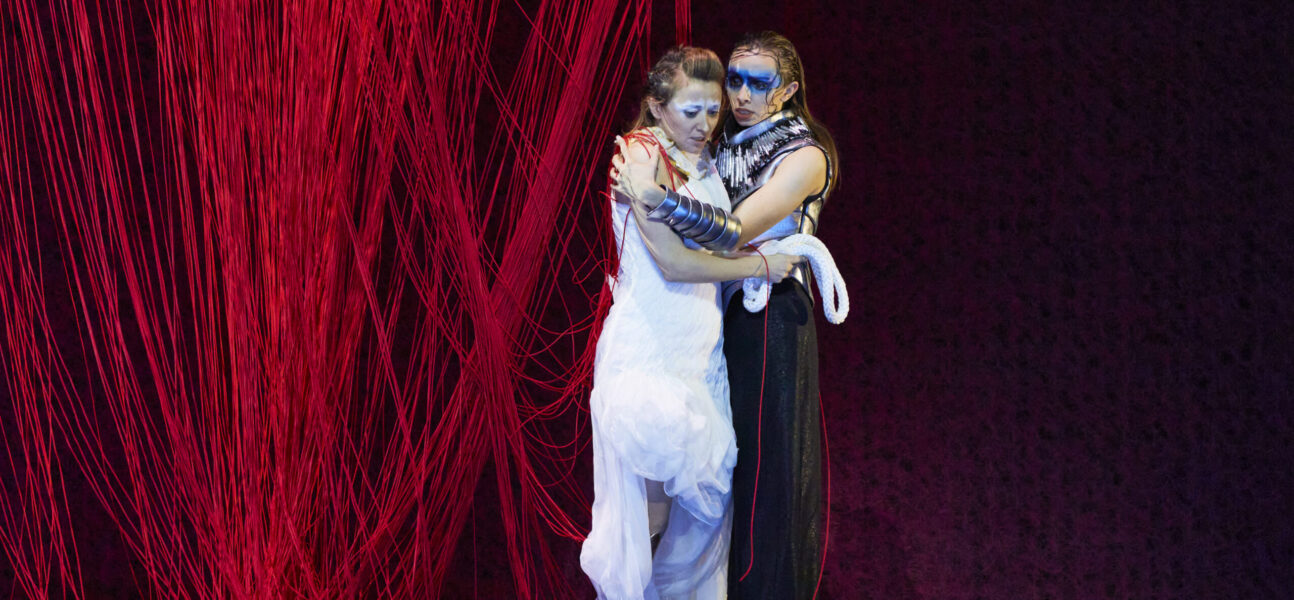 Dans le cadre d’Idoménée, le rouge évoque aussi la mer, toujours présente. Mer méditerranée où baigne le sang des soldats troyens ou crétois. Mer méditerranée où baigne encore le sang de milliers de personnes. Ces fils – qu’ils évoquent la mer, les liens amoureux ou d’emprise, le filet du destin… – sont rendus vivants, mouvants, par l’omniprésence de la danse – ce qui va de soi lorsqu’on traite du travail de Cherkaoui. La rencontre de la plasticienne et du chorégraphe produit une explosion esthétique et conceptuelle à la fois. Une réussite absolue.