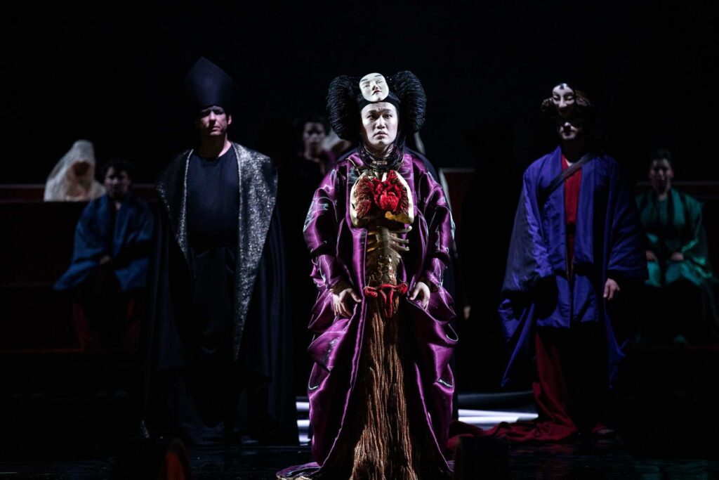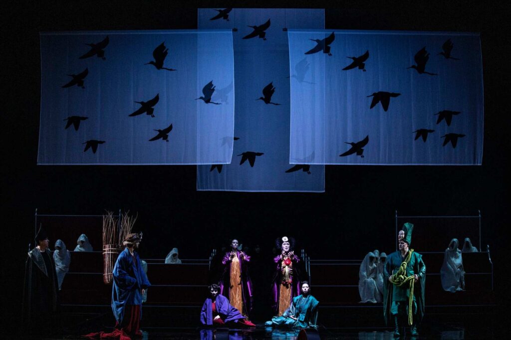 Au service de cette distribution, la mise en scène de Silvia Costa achève de transcender le diptyque, décidément fascinant. Entre les codes du Nô et ceux du théâtre européen, les personnages évoluent dans des espaces sobres violemment éclairés ou plongés dans une brume laiteuse puissamment évocatrices, où le poétique le dispute au merveilleux. Entre la salle et la scène, un taikobashi vermillon sert de trait d’union : le pont caractéristique des jardins zen évoque le passage du profane au sacré, nous aide à lutter contre les mauvais esprits, se purifier et se régénérer. La rivière est matérialisée par deux bassins dans lesquels les mains où les rames plongent au rythme syncopé d’une musique initiatique et envoûtante. Le dispositif scénique de Michele Taborelli propose des tableaux d’une somptueuse beauté dans leur évidente simplicité, telles ces stalles ornées de motifs orientaux ou encore la sublime scène de la traversée en bateau réduit à sa plus simple expression, surmonté d’un mât cruciforme ou en forme d’ancre, espoir en un apaisement voire une révélation et un renouveau. Les costumes créés par Camille Assaf sont fastueux et achèvent de faire de ce spectacle baigné de larmes un véhicule d’émotions intense où le spectateur se noie avec délices, dans une catharsis extatique quoique douce et mesurée, en subtil hommage au théâtre Nô. Après Nancy, le diptyque sera donné à Rennes, ville coproductrice. Mais il serait assez normal de voir ensuite les deux œuvres couplées intégrer le répertoire et être régulièrement présentées ensemble…