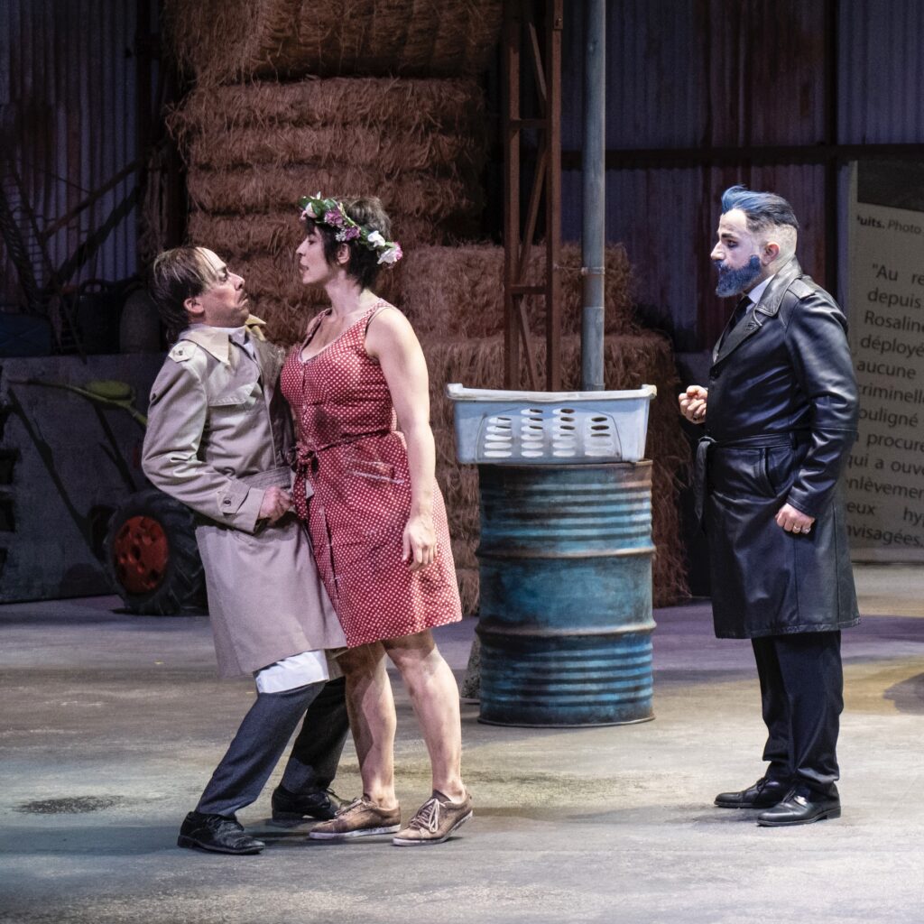 Il y a un univers Pelly. Une poésie burlesque et tendre. S’il dit souvent que c’est la musique qui guide ses mises en scène, que tout s’appuie sur les rythmes de la musique et du livret, on imagine bien qu’au départ, il y a d’abord un œil, un imaginaire, un crayon qui dessine. Ici, sur fond de ciel d’orage, un hangar en tôle ondulée, décati et rouillé, une citerne, des rouleaux de paille, un tas de fumier ; au centre, l’arrêt du car avec un tag BB ; à droite une maison grisâtre, la bergerie de Fleurette (Jennifer Courcier, piquante et acidulée).
