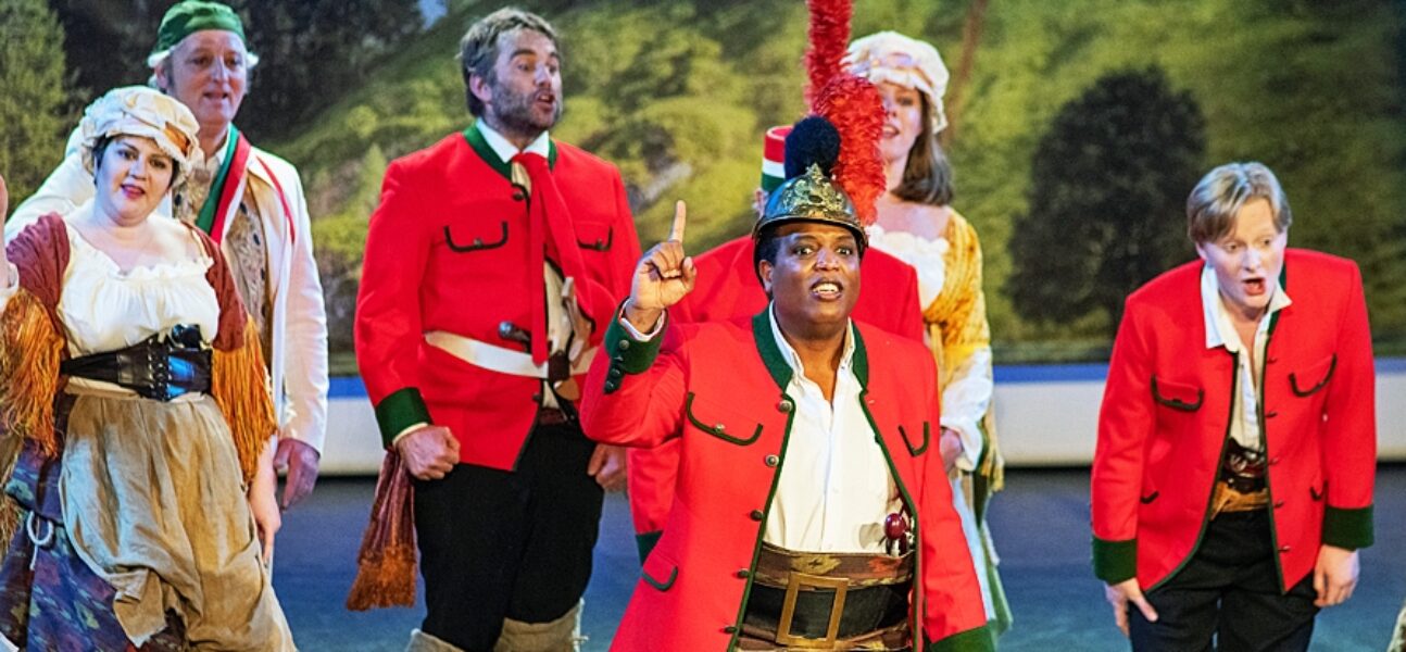 Yves Coudray, grand connaisseur d’Offenbach, sait manier les troupes, tout en respectant l’œuvre. Ce soir, les carabiniers ont bien tous leurs bottes et arrivent en scène, contrairement au dicton, pile-poil à l’heure. Les groupes de personnages (brigands, Italiens et Espagnols) sont clairement différenciés. Et surtout, les moments de bravoure sont un régal : les entrées des carabiniers, l’arrivée des Espagnols, la cour de Mantoue avec ses problèmes d’argent. Bien sûr, sans que l’on puisse parler véritablement de transposition, les rapports avec l’époque de la création (la fin du Second Empire) et la nôtre ne sont pas éludés, avec une espèce de passage à travers les siècles, que chacun peut interpréter à sa guise. La direction musicale de Laurent Goossaert est, comme à son habitude, parfaitement en phase avec l’œuvre, tant au niveau des tempi que de la dynamique : un entrain qu’il communique avec humour au plateau, qui le lui rend bien. Les chœurs sont fort bien préparés, et font également merveille ; on retiendra notamment le fameux chœur de la fin du Ier acte « Ce sont les bottes, les bottes, les bottes, les bottes des carabiniers », alternant le pianissimo et le forte. On notera également les charmants costumes de Michel Ronvaux, un régal de style et de couleurs.