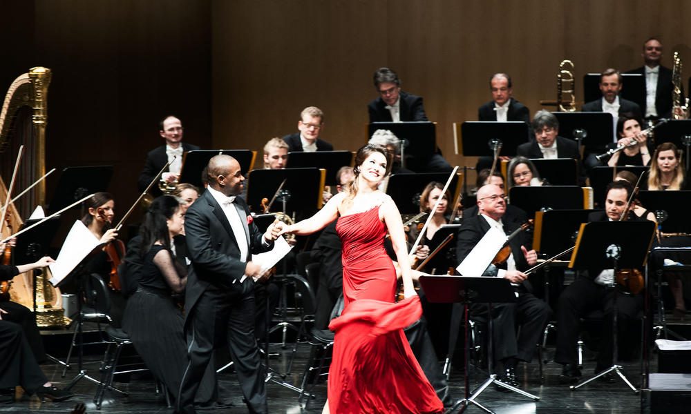 La belle surprise de la soirée vient de Lawrence Brownlee. Tout d’abord, le ténor semble en assez petite forme, avec une voix très peu puissante et vaguement nasillarde. Dans le Pirate, son Gualtiero manque d’éclat avant de montrer une bravoure et une endurance où le chanteur s’affirme de mieux en mieux. On oublie rapidement les nasalités et la voix se déploie à l’aune de ses remarquables moyens. On ne retient plus que le rayonnement radieux et la belle énergie déployée. Certes, son Arturo ne possède pas le caractère solaire de Pavarotti, mais comment résister à un « A te, o cara » aussi suave et délicat ? Dans le duo et le sublime « Vieni fra queste braccia », inutile de préciser que Lawrence Brownlee atteint sans problème le contre-ré qui nous fera tomber sans hésiter dans ses bras sans qu’il ait à se répéter. Après la pause (où l’on remarque la pochette écarlate assortie à la sublime robe de la cantatrice), on se délecte du « Je crois entendre encore » des pêcheurs de perles, avec ou sans le contre-ut (pourtant bien là) et dans un français impeccable, s’il-vous-plaît. Mais c’est là que tout commence, puisque suivent les neufs contre-ut de « Pour mon âme ». Et au moment des rappels, lorsqu’arrive son tour, le ténor américain glisse quelques mots à la chef d’orchestre qui se met à fouiller dans ses partitions, avant de se diriger vers le premier violon (une femme d’une rare distinction) elle-même ressortant une partition enfouie avant que d’être suivie par tout l’orchestre. Au lieu de chanter comme prévu l’air de la Favorite, Lawrence Brownlee, très en forme et galvanisé sans doute par l’ambiance assez unique du Festspielhaus, réédite le tour de force de Juan Diego Flórez à Bastille. Le voilà qui repart dans un « Pour mon âme » exalté, alignant sans sourciller neuf contre-ut supplémentaires… On commence à se perdre dans les comptes, entre Bellini et Donizetti et leurs notes accrochées dans les étoiles. Mais quel bonheur et quel jour prospère ! Ainsi, les quelques critiques que l’on aurait pu avancer ici ou là s’évanouissent devant tant de brio : un ténor en surchauffe et en suraigus percutants doublé d’une soprano digne de Hollywood à la prononciation pas toujours impeccable mais à la séduction vocale indéniable, une direction d’ orchestre enthousiaste… Bref, si tout n’était pas parfait, l’impression, elle, est évidente : voici une soirée d’exception que l’on n’est pas près d’oublier. Ne serait-il pas possible de la bisser ?