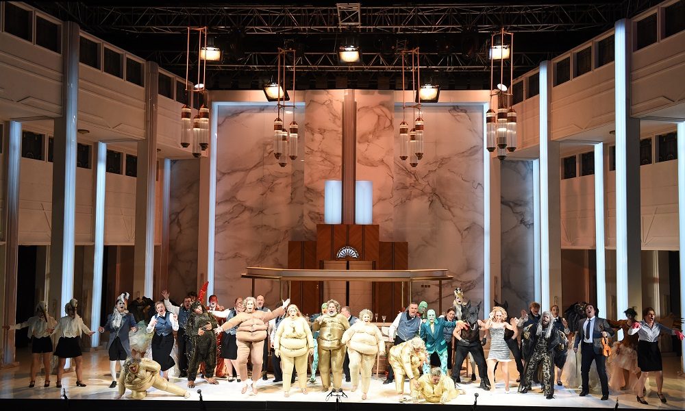 Est-ce le fruit de cette coopération, les moyens ne semblent pas avoir manqué à en juger par l’imposant décor, le nombre et la variété des costumes. Leurs auteurs, qui règlent aussi et plutôt bien les lumières, Clément et Sanôu, ont situé l’action tout entière dans un hôtel de luxe. L’idée n’est pas neuve mais son efficacité est éprouvée. L’espace unique est d’abord le grand hall au fond duquel un ascenseur dessert les étages ; puis il devient un salon privé pour VIP probablement situé au sommet de l’hôtel et ensuite un bar en sous-sol, qui sera aussi le décor de la bacchanale finale. Dans ce palace art-déco aux murs recouverts de marbre (du Pentélique ?) une armée de serviteurs s’affaire. L’un d’eux, en tenue de liftier, n’est autre qu’Aristée/Pluton ; ce malfaisant cache le serpent fatal, jusque-là animal de compagnie d’un client de l’hôtel, dans les bacs à fleurs, si bien que la mort d’Eurydice n’est plus un accident imprévu mais l’aboutissement d’un plan. Même si l’on est par principe réticent devant les modifications que s’autorisent les metteurs en scène, dans la mesure où elles constituent des dérobades devant un programme imposé, quand il ne s’agit pas d’outrecuidance, on reconnaît volontiers que la rapidité de l’enchaînement impose la proposition, qui a sa logique, sans bouleverser l’intrigue. Pertinente aussi l’option de faire de l’Opinion Publique une technicienne de surface lancée dans une chasse obsessionnelle aux « saletés » que son activité lui permet de découvrir. On sera plus réservé sur celle qui montre les habitants de l’Olympe en Bibendum dorés de la tête aux pieds et obèses jusqu’à l’impotence ; la vocation comique de ce pittoresque nous a masqué une éventuelle intention politique de dénoncer l’obscénité des privilèges des puissants. La « modernisation » des dialogues par Alain Perroux n’autorise du reste pas cette interprétation, car les allusions à une actualité encore récente – « 49-3 », « merci pour ce moment » – visent seulement à établir une connivence avec le public, comme les « je like » ou « what else » salués par des bordées de rires. Il y aurait là matière à réflexion sur le fait qu’aujourd’hui ces références communes aux spectateurs sont tirées de leur environnement quotidien et non d’un patrimoine culturel mais cela nous entraînerait trop loin. Rien d’étonnant dès lors que la musique d’Offenbach se réduise, pour beaucoup, à son ossature rythmique : les galops déclenchent infailliblement les battements de mains pavloviens, alors que l’entracte qui précède le chœur du sommeil est joué dans un brouhaha qui dure. Sans doute parce que, puisque des machinistes enlèvent à vue les meubles du hall pour dresser la table du conseil d’administration de l’Olympe, beaucoup semblent croire que ce qu’on entend n’est pas de la musique à écouter.