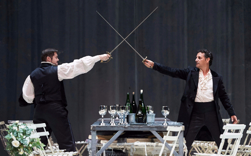 C’est d’ailleurs dans cette ultime partie que Jürgen Flimm, le metteur en scène de cette nouvelle production milanaise, parvient à s’extirper du carcan esthétique où son imagination s’essoufflait. Vidé des chaises qui encombraient l’unique décor – des rideaux utilisés pour délimiter l’espace –, le plateau est aussi débarrassé des choristes qui s’agitaient depuis le début de la soirée derrière les protagonistes, sans doute pour donner une impression de mouvement. Une harpe traverse lentement la scène tandis que Desdemona chante son air du saule. On perçoit soudain une volonté de théâtre dans le théâtre sans comprendre le sens de cette nouvelle orientation. Pourquoi Jago, une fois Desdemona assassinée, vient dans la salle prononcer les répliques initialement destinées à Lucio, le confident d’Otello – rayé par conséquent de la distribution ? Pourquoi embrasse-t-il une jeune femme dont on n’avait jusqu’alors pas remarqué la présence ? En l’absence de notes d’intentions, toutes les suppositions sont permises. Est-ce bien raisonnable s’agissant d’une œuvre méconnue dont le deuxième – voire le troisième – degré de lecture ne saurait être envisagé alors que le premier n’est déjà pas si évident ? Des applaudissements mesurés tombent en même temps que le rideau, loin de l’enthousiasme qu’aurait dû susciter l’événement, sans que la mise en scène l’entière ne porte l’entière responsabilité de ce succès mitigé.