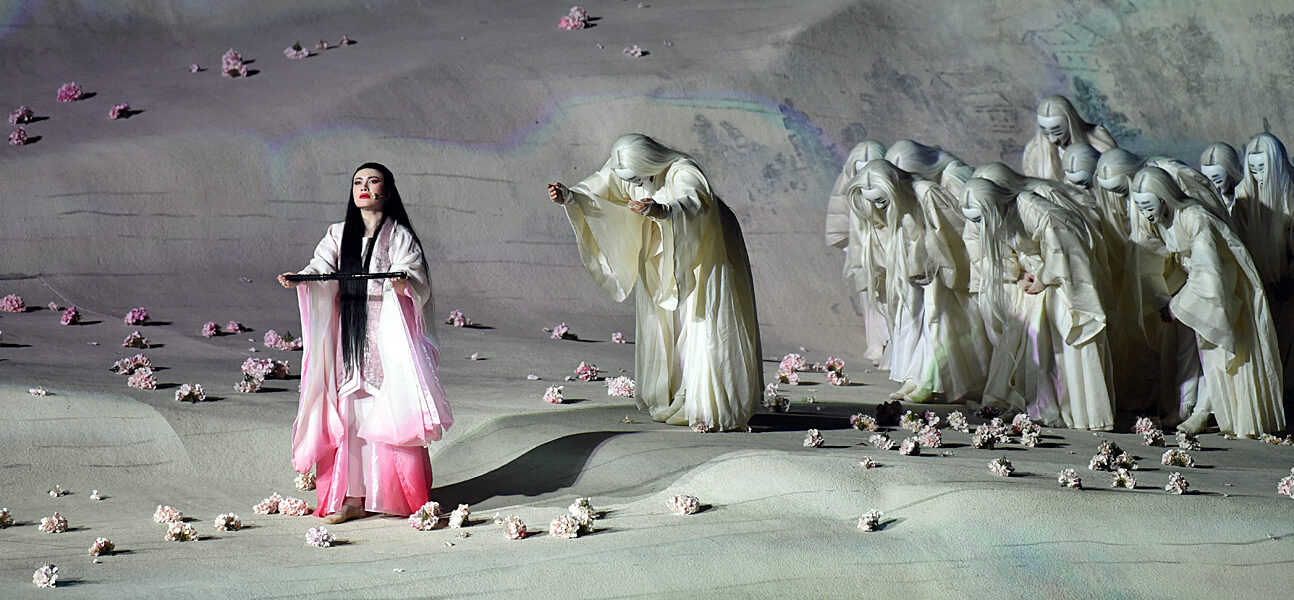La première concerne l’immensité de la scène, qu’il faut « meubler » d’une manière ou d’une autre. Et force est de constater qu’Andreas Homoki y parvient difficilement, malgré les groupes de personnages démultipliés, les mauvais génies qui entourent Butterfly, la qualité des animations vidéo, les jolies couleurs pastel qui évoquent le passage des saisons, et malgré aussi l’incendie final peu en situation. L’ensemble reste au total un peu terne et répétitif. Surtout, du drame intime se déroulant dans une maison japonaise réelle ou rêvée, il ne reste plus rien. Pas d’endroit où s’abriter, où vivre sereinement un moment d’amour, où réfléchir calmement. Au contraire, tout n’est, pendant deux heures, que mouvement, ce qui bien sûr soutient l’attention, mais donne un peu le tournis.