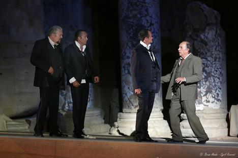 Alors que le Théâtre antique avait quasiment atteint son taux de remplissage maximum et que les téléspectateurs épris d’art lyrique attendaient impatiemment de participer à cette grande soirée verdienne des Chorégies d’Orange sur France 3 et Culturebox… Alors que les musiciens de l’Orchestre philharmonique de Radio France s’étaient déployés dans la fosse au pied du gigantesque mur de scène où une immense marotte en bois symbole du bouffon déchu, évoquait d’emblée la fin tragique du héros de la tragédie de Victor Hugo, adaptée par Francesco Maria Piave sous la férule de Verdi… Jean-Louis Grinda, le nouveau directeur des Chorégies, annonçait tranquillement au public qu’une indisposition survenue en fin d’après midi empêchait Mikko Franck de diriger sa phalange mais que le maestro Alain Guingal allait le remplacer au pied levé sans la moindre répétition. Tonnerre d’applaudissements à son arrivée au pupitre. Il n’y avait plus qu’à laisser le miracle s’accomplir. Dans ce lieu magique, on allait assister à un Rigoletto chargé d’adrénaline. Orchestre dopé, artistes du chœur et danseurs énergisés conféraient à la mise en scène de Charles Roubaud — Il a choisi d’évoquer la Renaissance en situant l’œuvre dans les Années folles — une ambiance survoltée.