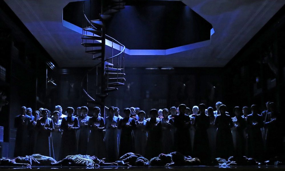 Créé en janvier 2013, coproduit avec Tours, Avignon et à Massy, ce Roméo et Juliette arrive finalement dans le théâtre que dirige celui qui en a assuré la mise en scène (en attendant une dernière étape à Reims le mois prochain). Pour affronter ce mythe théâtral qu’est la pièce de Shakespeare, même dans la version Barbier et Carré qu’il avait déjà monté à l’Opéra de Nice en 2002, Paul-Emile Fourny propose une lecture qui n’a jusqu’ici guère convaincu nos collègues. Elle s’appuie sur quelques éléments récurrents mais pas forcément très explicites, à commencer par l’image du cerf. Emmanuelle Favre a conçu pour l’intérieur des Capulet un décor élégant, qui rappelle le cabinet de curiosité où démarrait la Fairy Queen de Glyndebourne vue ensuite à l’Opéra-Comique : trois murs occupés par des étagères où les trophées de chasse voisinent curieusement avec d’épais volumes reliés. Un grand escalier en colimaçon, légèrement décentré, encombre la scène pendant toute la première moitié de la soirée, même s’il ne sert vraiment que pour la scène du balcon. Le cerf revient lors du mariage des deux héros (l’animal vu par saint Hubert, avec sa croix entre les andouillers, apparaît en surimpression sur le rideau), puis à nouveau au quatrième acte, où il trône, entier, sur le toit de la chambre de Juliette, et où des crânes et des bois encadrent le lit de la jeune fille. Les amoureux éternels, bêtes traquées par une société hostile ? Soit. Les costumes de Dominique Burté tentent aussi d’opposer deux camps : les austères Capulet, uniformément vêtus de grands cache-poussières 1900 dans des teintes allant du beige au gris, et les Montaigu presque marginaux, dans leurs tenues colorées et un peu seventies. Hélas, ils enferment Juliette dans des robes peu attrayantes (heureusement, on a vite renoncé, après Tours, à la perruque rousse avec front épilé), et Roméo n’est pas vraiment gâté non plus. Par-delà ces bizarreries, c’est surtout la jeunesse des personnages qui fait défaut ici, mais cela tient peut-être aussi à leurs interprètes.
