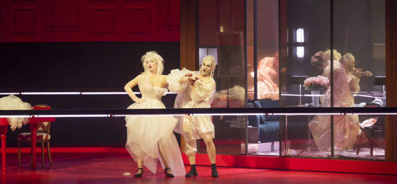 Enfin la musique de Rossini commence ; au centre de la scène une construction peut-être hexagonale qui s’étend à cour, dont les parois vitrées laissent voir l’intérieur si les lumières l’autorisent, un lambris rouge qui enserre les côtés et le fond de scène, un clavecin rouge échoué dans l’espace côté jardin, un fauteuil à l’avant-scène à cour, la déambulation scénique de la Rosina âgée, tout cela compose un ensemble à l’organisation peu claire, et ni les costumes ni les coiffures des personnages n’aideront le spectateur, car ils relèvent de la même extravagance dont il nous manque les clefs pour la définir. Ainsi, il nous a fallu un long moment pour comprendre que cette femme que nous avons prise pour une professionnelle du sexe active malgré l’heure matinale – le lever du jour, quand la sérénade va finir – était en fait Berta, l’employée de Bartolo. M. Bénichou dit la voir comme une proie potentielle pour Almaviva, mais il la montre comme une goule entreprenante.