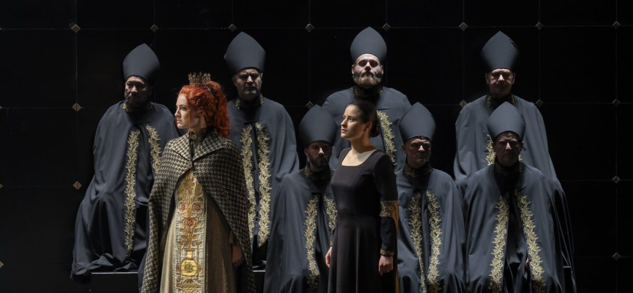 La mise en scène de Pierre-Emmanuel Rousseau projette le drame dans un moyen-âge fantasmé où prédomine le noir rehaussé de quelques touches dorées. Il y a quelque chose de Don Carlos dans cette vision obscurantiste de Tancredi où d’inquiétants frocards habillent la nudité du décor. Le pouvoir religieux prend le pas sur la junte militaire commandée par un Orbazzano aux manières de reître. Est-ce parce que nous sommes à Rouen qu’Aménaïde dans sa prison évoque Jeanne d’Arc ? Si tel est le cas, il s’agit de la seule fantaisie que s’autorise une approche respectueuse du livret, aux clairs-obscurs esthétisants, qui voudrait plus de liberté dans le mouvement pour paraître moins appliquée.